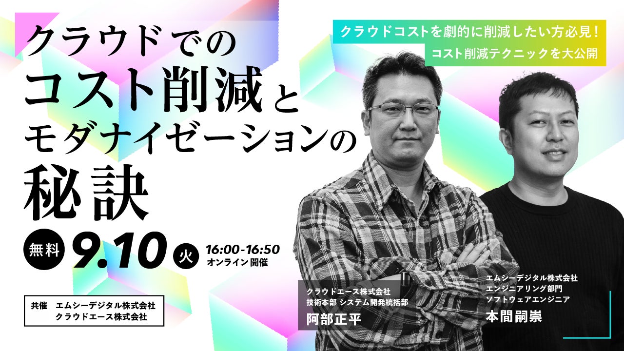 エムシーデジタル株式会社(本社:東京都千代田区、代表取締役社長:河内 伸学、以下エムシーデジタル)は、クラウドエース株式会社(本社:東京都千代田区、代表取締役社長:青木 誠、以下クラウドエース)と共催で、2024年9月10日(火)に「クラウドでのコスト削減とモダナイゼーションの秘訣~エムシーデジタルとクラウドエースが教える実践テクニック~」と題してウェビナーを開催することを決定いたしました。