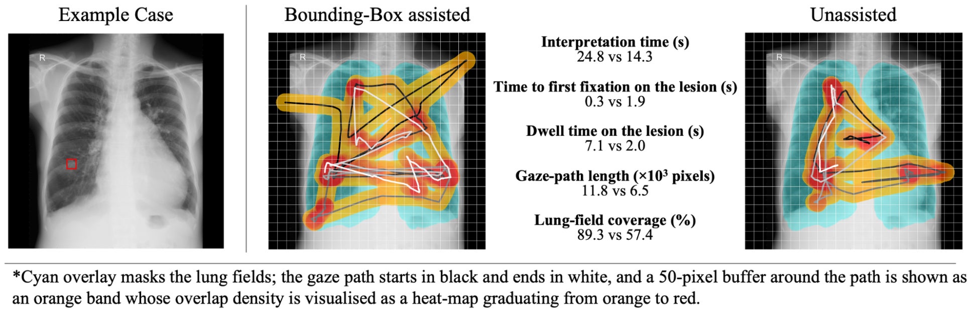 近年、胸部X線をはじめとする放射線画像診断の分野では、病変候補を枠表示などで提示するAI支援システム(CAD)が臨床現場で広く利用されています。これらの表示は診断の補助として有用である一方で、放射線科医の判断を含めた読影プロセスそのものに影響を及ぼしている可能性が指摘されています。そこで本研究では、CAD表示が読影時の視覚探索行動にどのような影響を及ぼすかを、アイ・トラッキングを用いて検証しました。