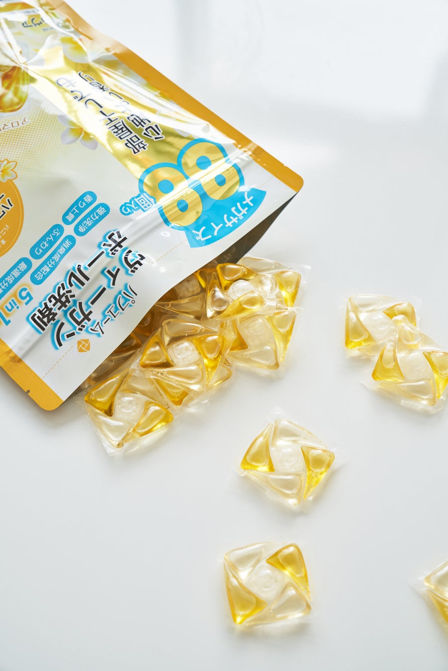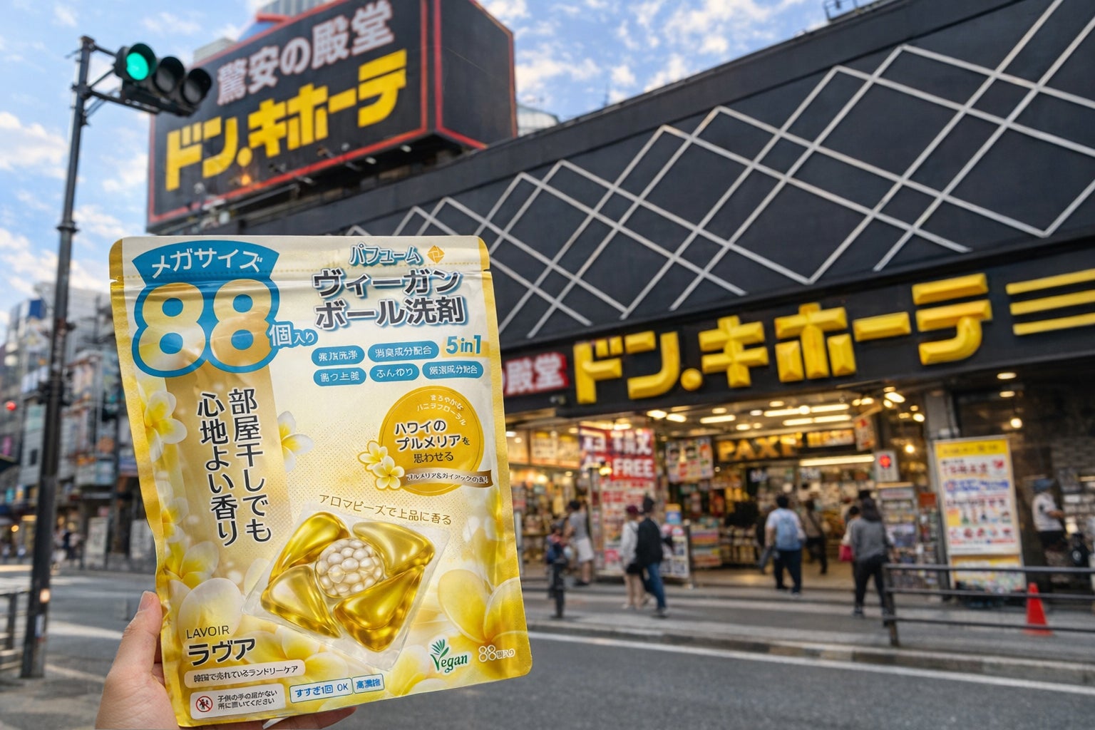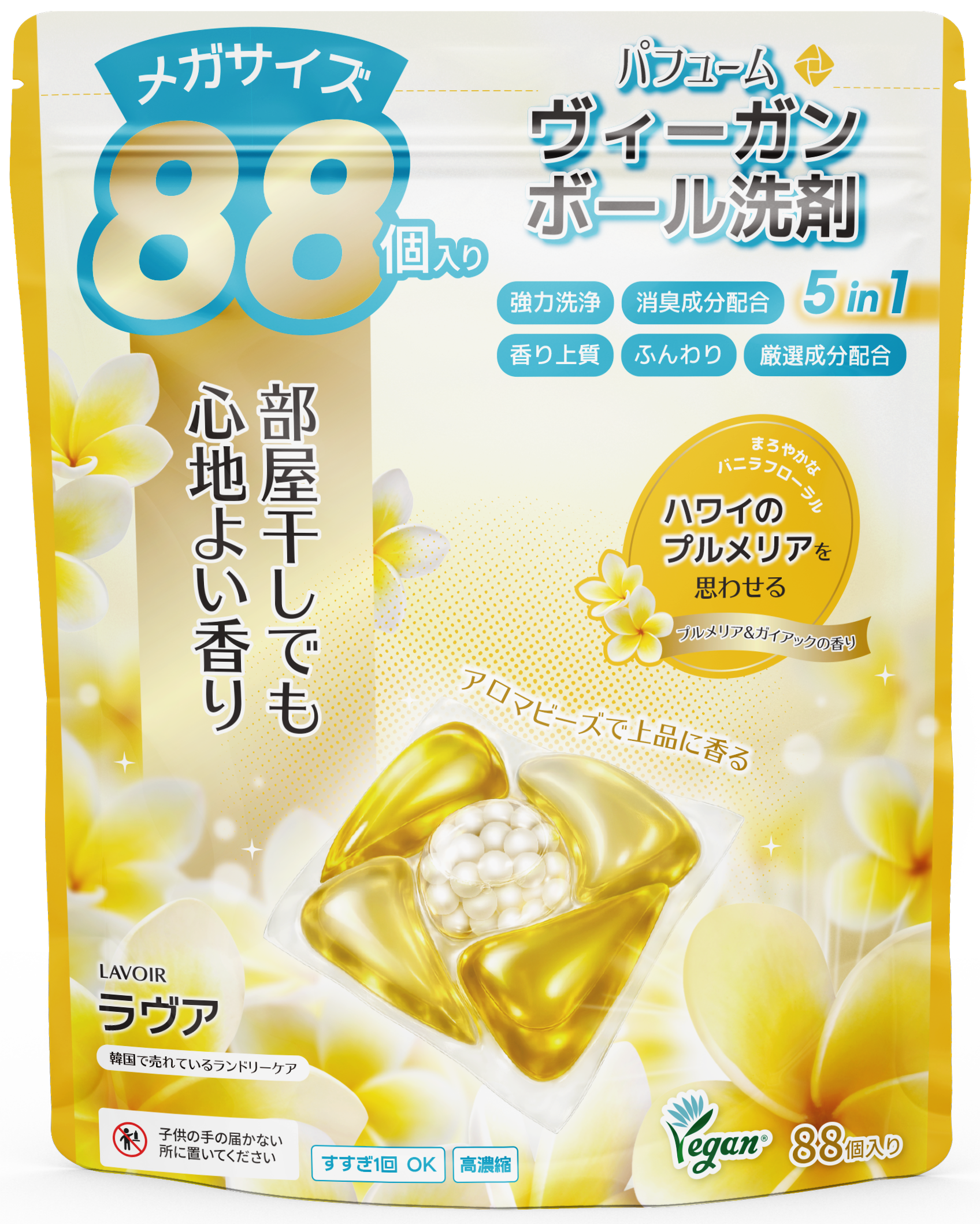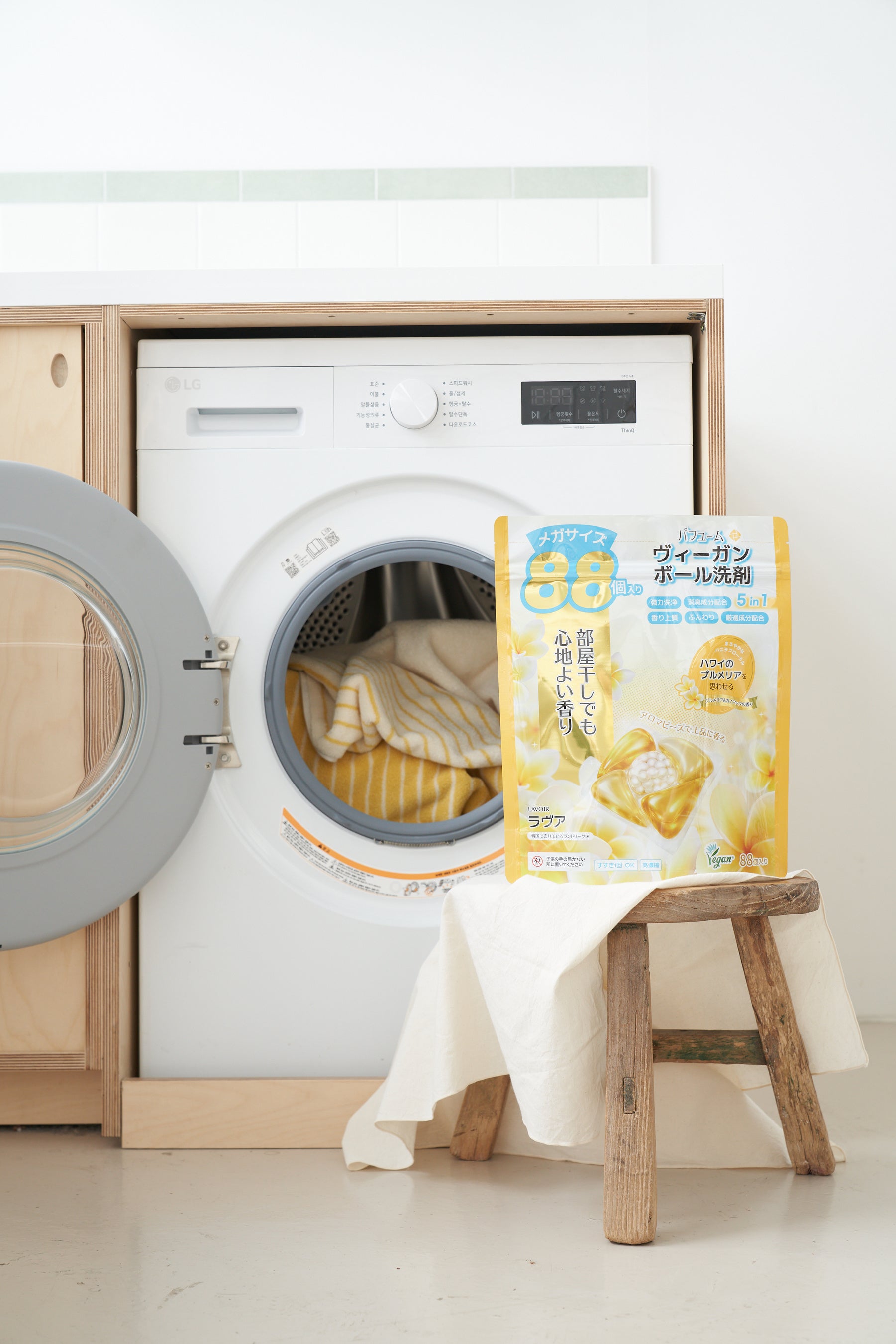 ドン・キホーテと共同企画した香り強化型、ヴィーガンボール洗剤88個入り(プルメリア&ガイアックの香り)