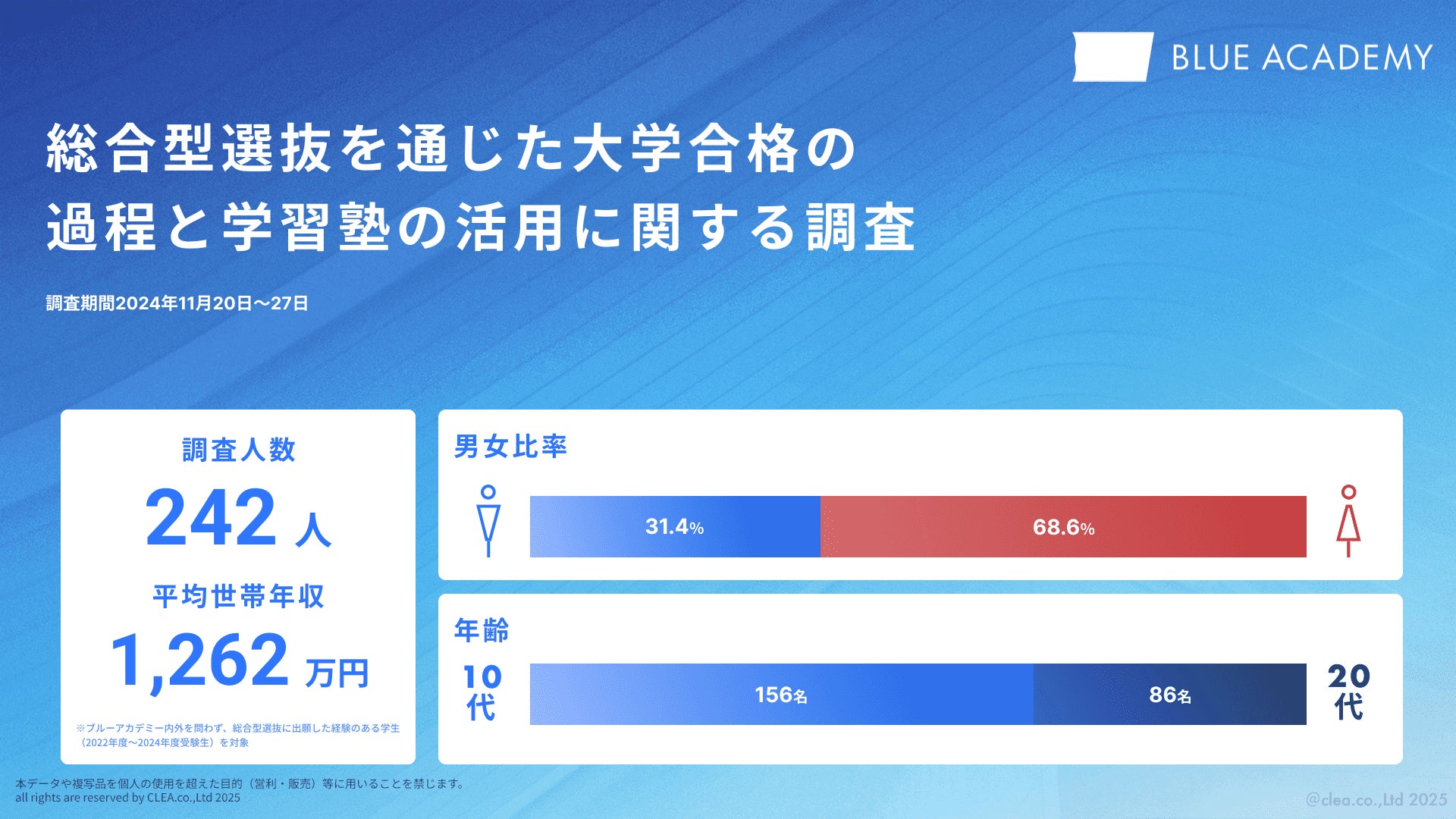 こうした背景のもと、当社では2024年11月20日~27日にかけて「総合型選抜を通じた大学合格の過程と学習塾の活用に関する調査」を実施し、10代・20代を中心とした242名(女性166名、男性76名)から任意回答を得ました。