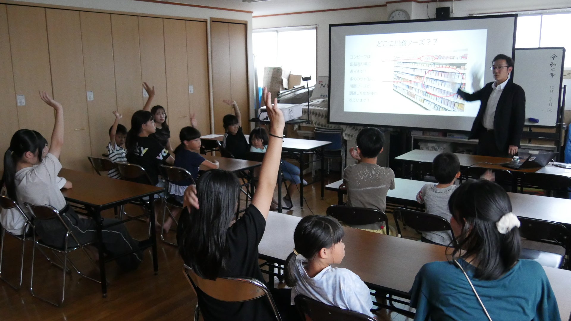 【クイズ形式で集中力アップ】 ただ会社の説明をするだけでなく、スライドやクイズを交えながら、子どもたちにも分かりやすい言葉で「食品商社がどのような役割を果たしているか」を伝えていただきました。「ノザキのコンビーフはどこから来るの?」「有名なカフェで川商フーズが関わる商品はどれ?」といった身近な疑問を入り口に、子どもたちは熱心に耳を傾けていました。
