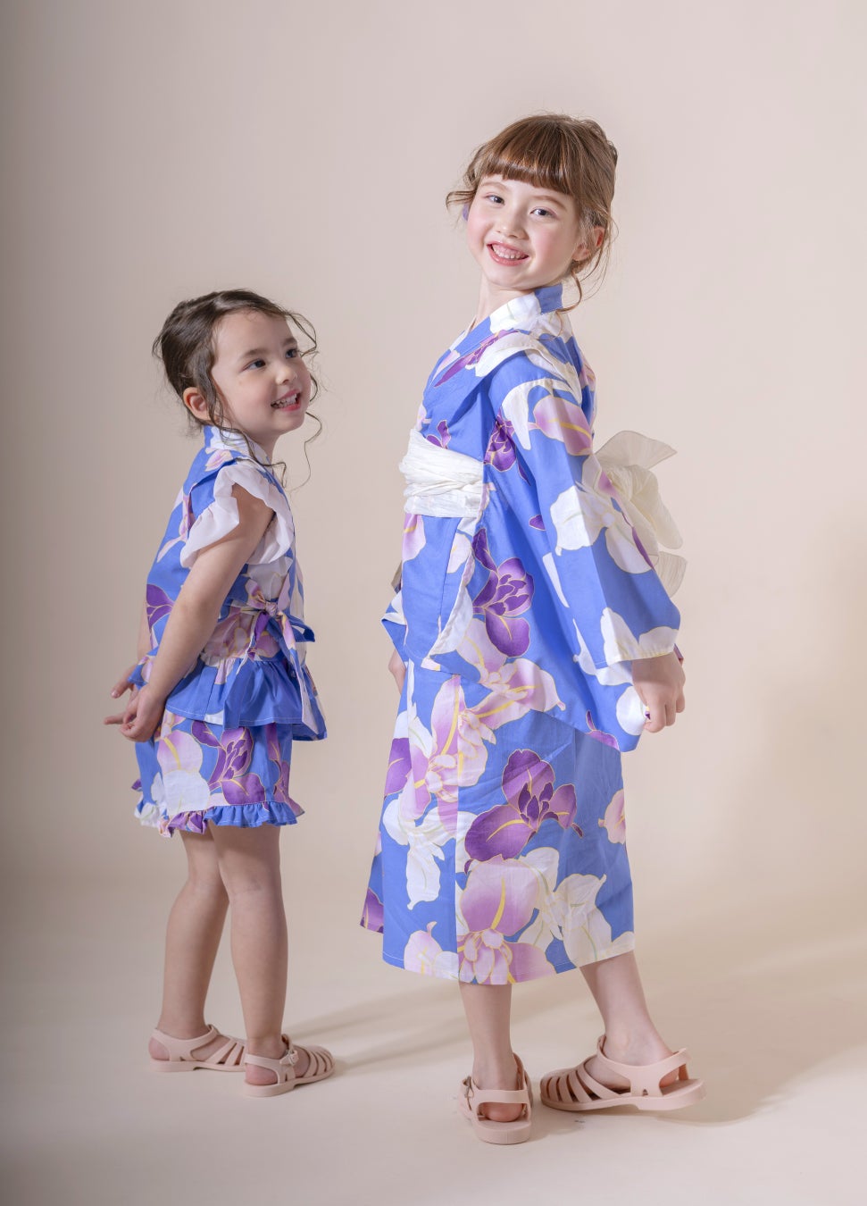 フリルをデザインアクセントとしたキッズ女の子甚平も、一部同テキスタイルでのカラバリにて販売いたします。