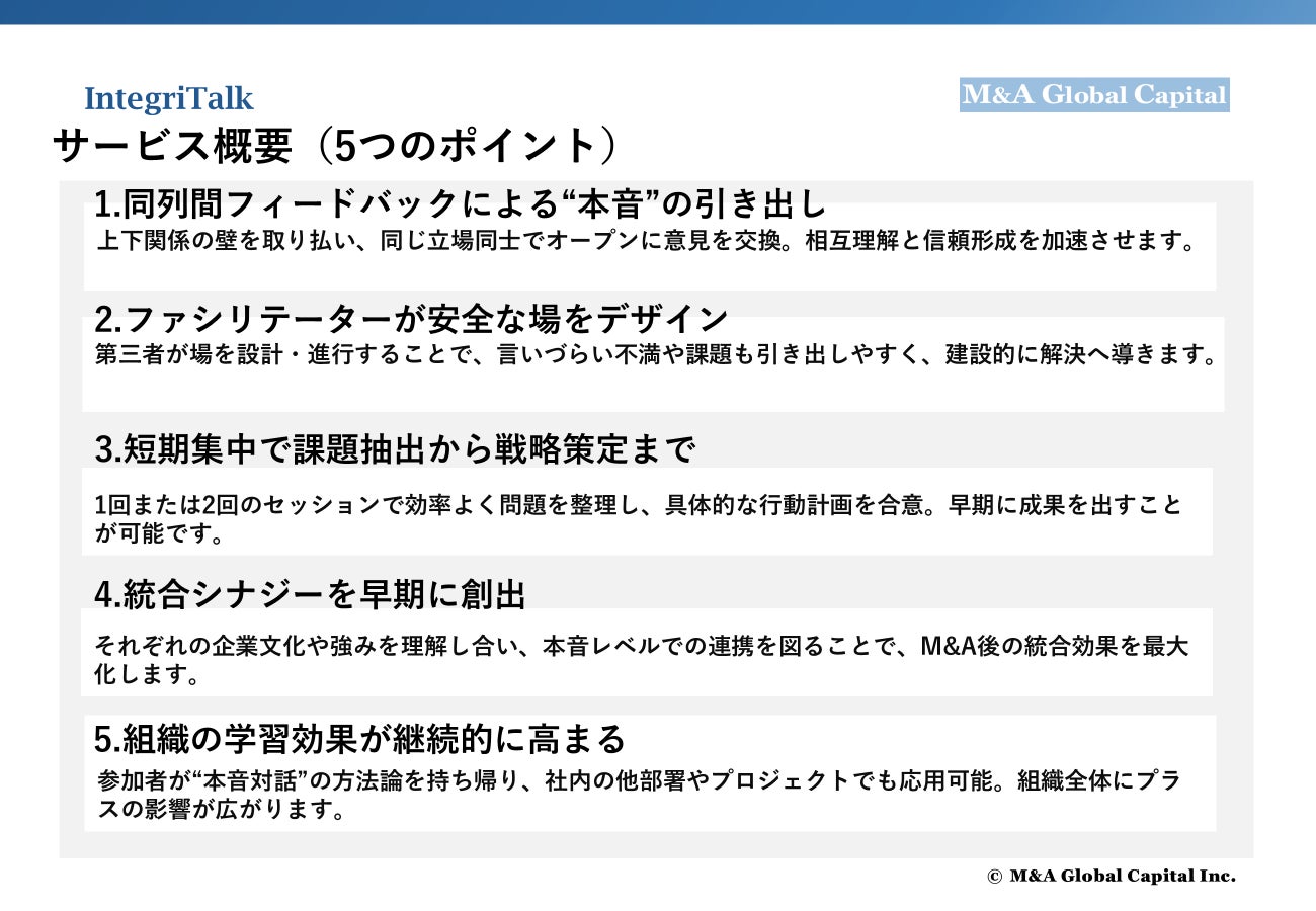株式会社M&Aグローバルキャピタル(本社:東京都港区、代表取締役:目等 雄大)は、このたびM&A後の経営統合期に特化した新サービス「IntegriTalk(インテグリトーク)」をリリースいたします。本サービスは、M&A後に生じやすいコミュニケーションや企業文化のギャップを“本音対話”で解消し、組織の一体感とシナジー創出を早期に実現することを目的としています。
