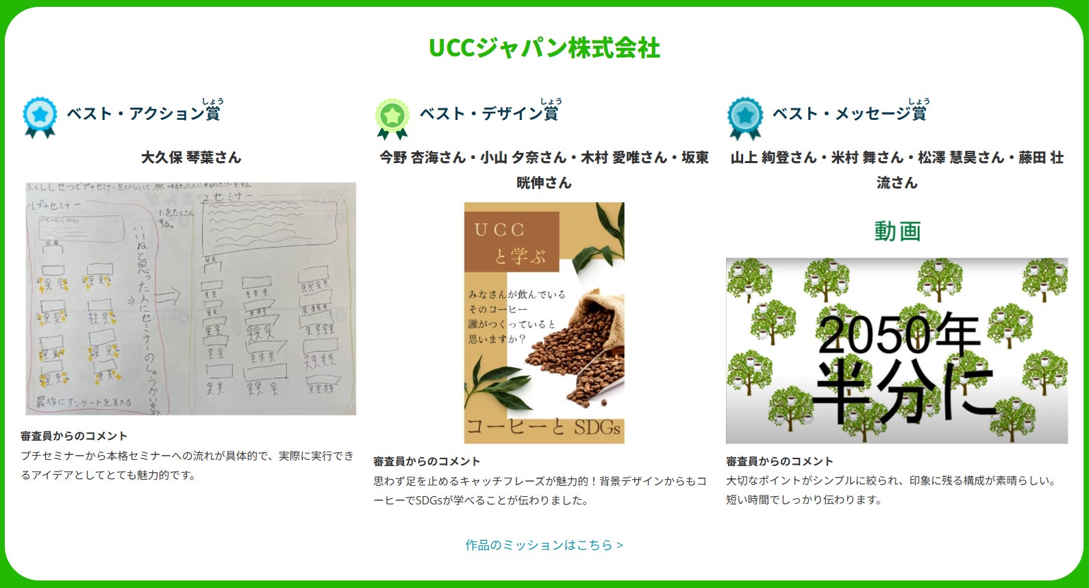 UCCのミッションには43作品ものアイデアが集まり、特に印象的だった3作品には3月15日の表彰式で「UCCミッション賞」として賞状、コーヒーの苗木、上島珈琲店などで使えるプレシャスカードを贈呈しました。
