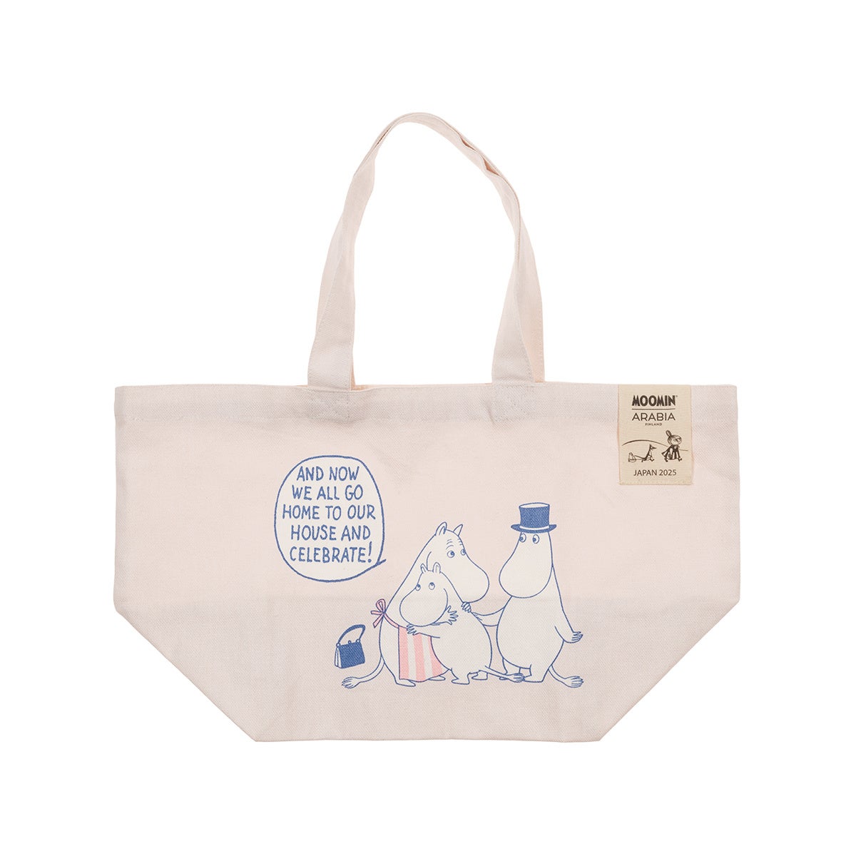 メインのイラストは家族が抱き合うシーンで、背景には青いムーミンやしきが描かれ、煙突から歓迎の煙が上がっています。