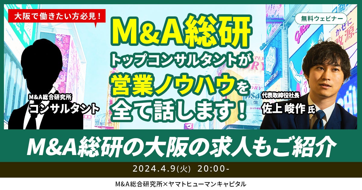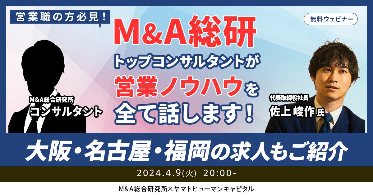 ヤマトヒューマンキャピタル株式会社(本社:東京都千代田区、代表取締役:堀江 大介)は、2024年4月9日(火)20:00よりオンラインにて、株式会社M&A総合研究所代表取締役社長佐上峻作氏にご登壇いただくウェビナー『M&A総研トップコンサルタントが営業ノウハウを全て話します!』を開催いたします。