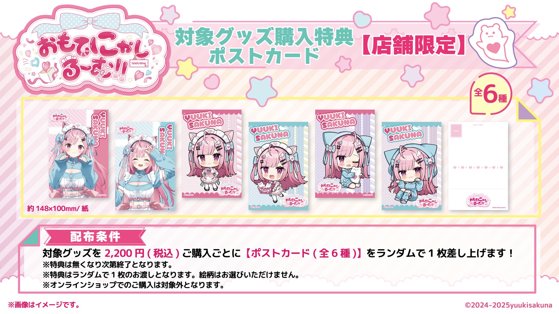 期間中、「結城さくな×おもてにゃしるーむ」グッズ商品をご購入2,200円(税込)毎に【ポストカード(全6種)】をランダムで1枚差し上げます。