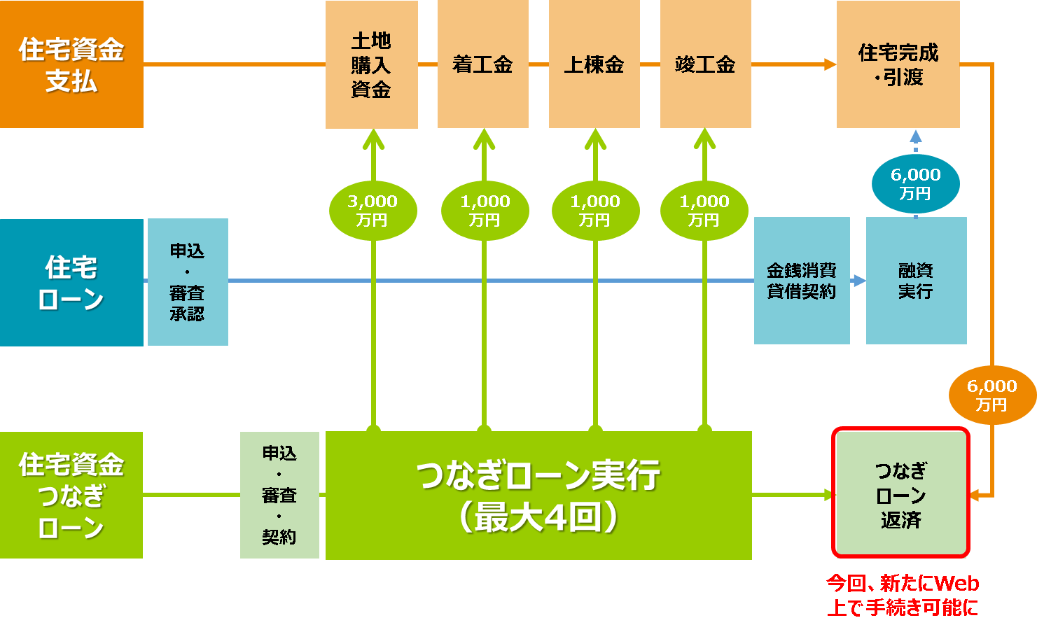 ※1 住宅資金つなぎローンは、お客さまが注文住宅を購入する場合等に、土地の購入資金や建物の着工金、中間金など、住宅ローンの本融資が実行される前に必要となる費用を、一時的に立て替える商品です。