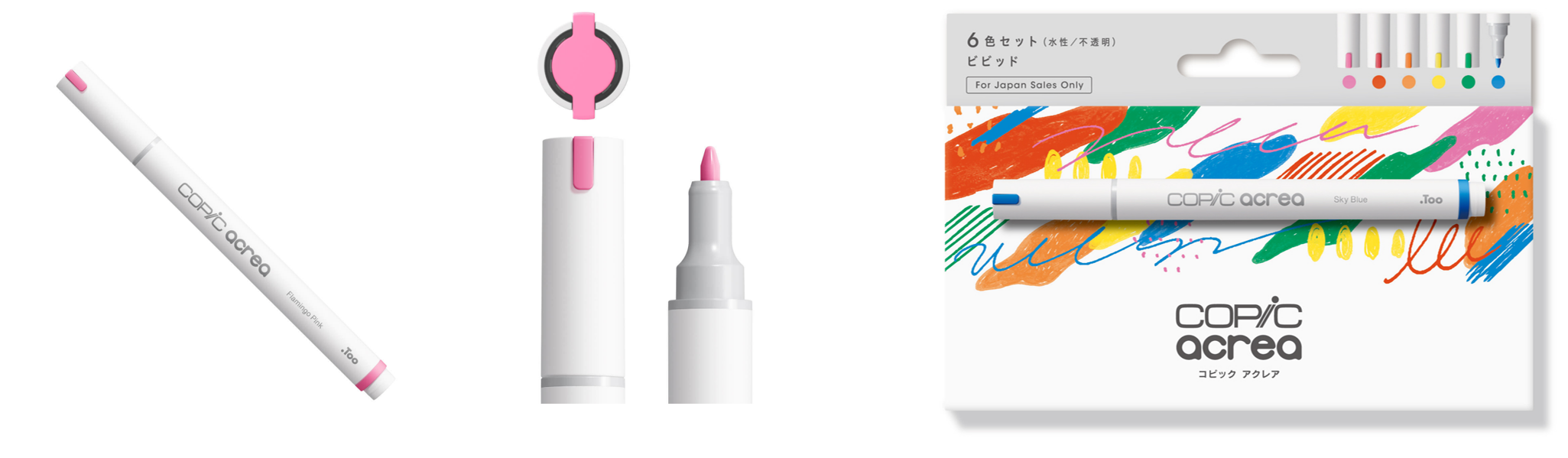 「コピック アクレア」は、水性顔料インクのカラーマーカーで、紙はもちろん金属、木、ガラス、プラスチックなど様々な素材に描くことができるマーカーです。