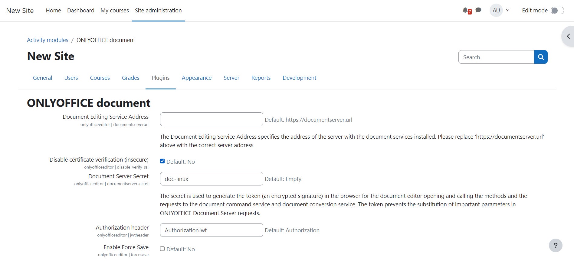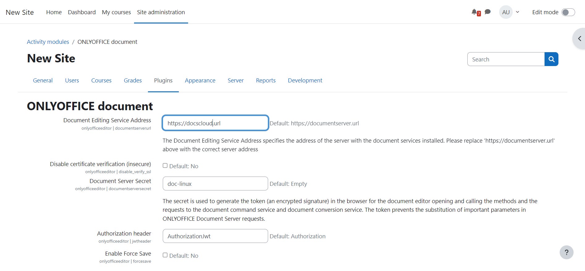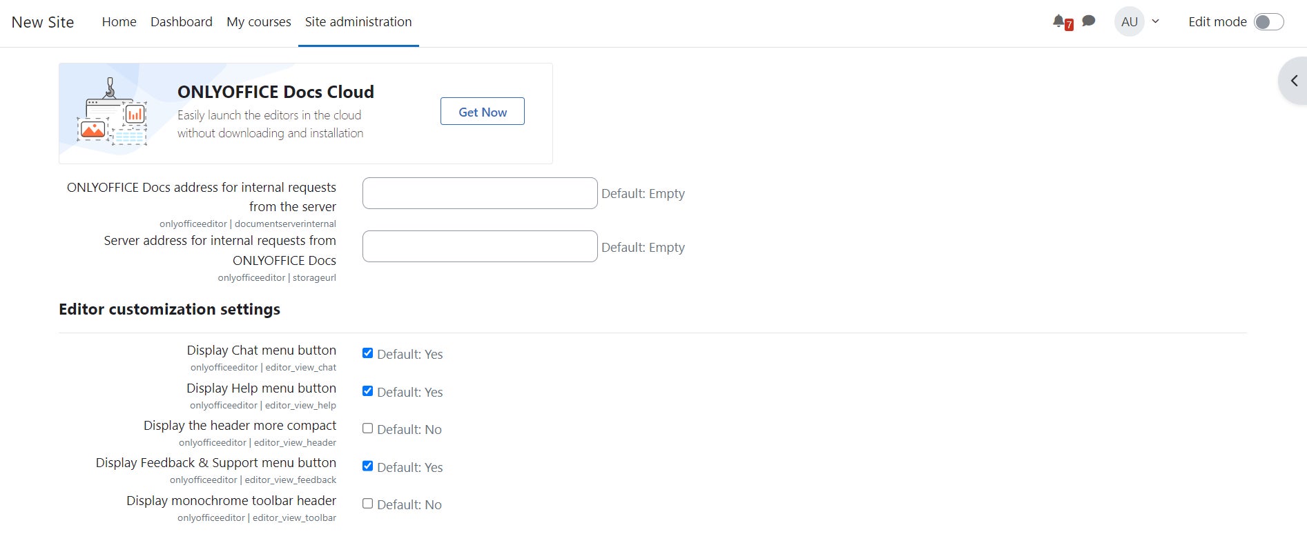ONLYOFFICE Docsクラウドアカウントを作成し、Moodleの管理者設定にそのURLを挿入する必要があります。