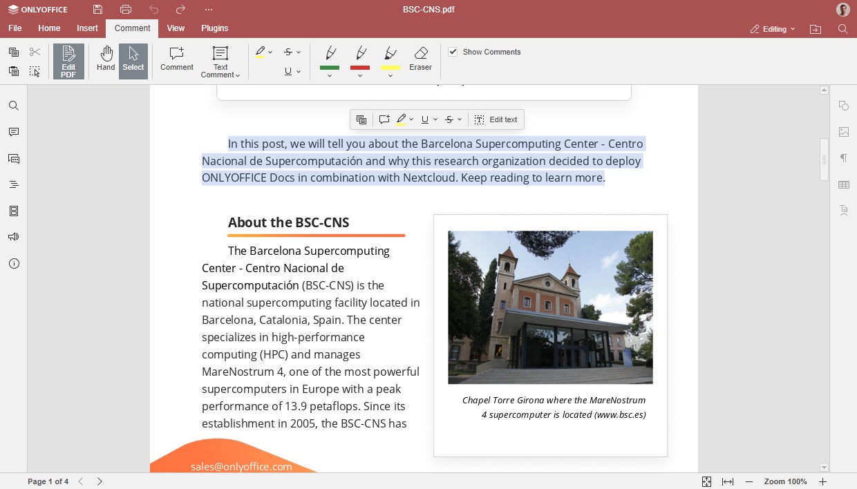 ONLYOFFICE Docsのバージョン8.1では、ユーザーが普遍的で一般的なフォーマットと対話できるよう、PDFエディタを導入しました。したがって、Moodleユーザもこのツールの恩恵を受けることができます。PDFエディタは以下をもたらします:
