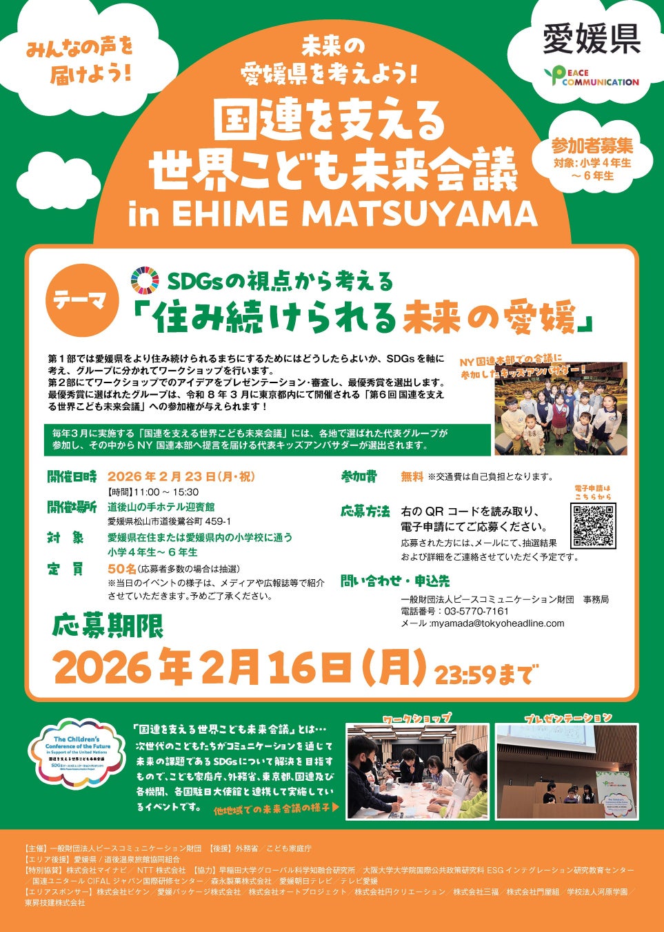 一般財団法人ピースコミュニケーション財団は、愛媛県在住または愛媛県内の小学校に通う4~6年生を対象にした「国連を支える世界こども未来会議 in EHIME MATSUYAMA」を道後山の手ホテル迎賓館にて開催します。