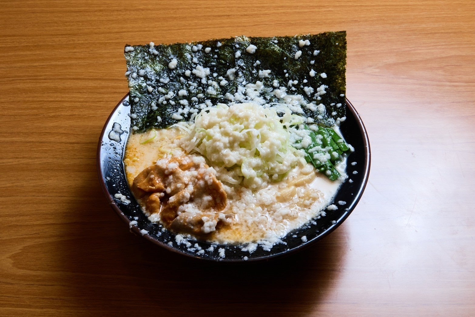 トッピングは大阪梅田店限定の夜の誘惑と同じく、大量の背脂とホルモンをトッピングしておりますが、夜の誘惑の2倍のホルモンがトッピングされています。