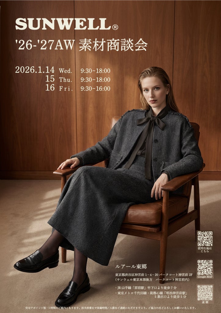 株式会社Cloverse(本社:東京都港区、代表取締役:中谷健太郎)は、繊維商社サンウェルの26/27AW商談会において、商談会の当日直前まで素材や最終サンプルの確定が難しい状況の中でも、案内状・ルックカタログ・商談会当日の動画ビジュアルを制作しました。