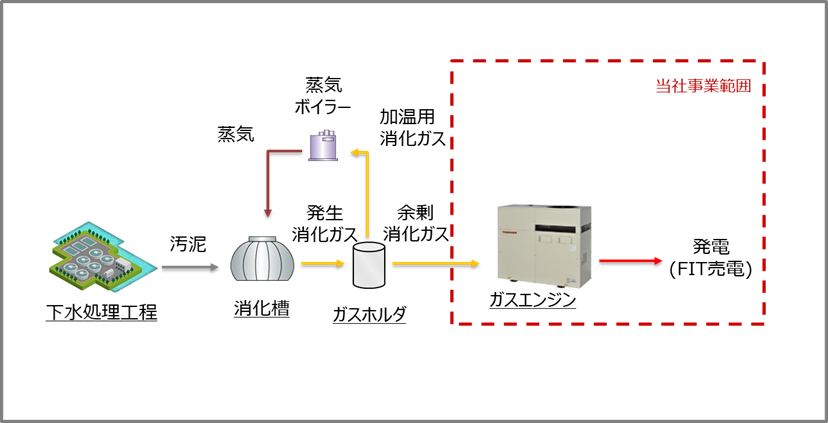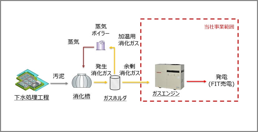 本事業は、民間の資金とノウハウを活用した民設民営方式による下水処理場での消化ガス※1発電事業であり、Daigasエナジーが赤穂市から借り受けた下水管理センター内の事業用地に発電設備を建設し、同センターで発生する消化ガスのうち余剰の消化ガスを活用してバイオマス発電を行い、FIT制度を利用して20年間の発電事業を行います。
