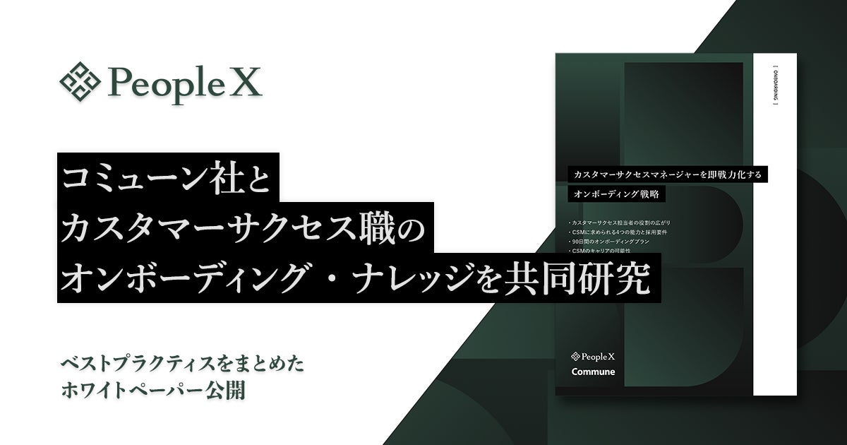 エンプロイーサクセス事業を推進する株式会社PeopleX(本社:東京都渋谷区、 代表取締役CEO:橘 大地、以下:当社)は、全職種の即戦力化を支援するために、オンボーディング・ナレッジ(※)を蓄積しており、その第一弾アウトプットとしてカスタマーサクセス職の新入社員を即戦力化するためのベストプラクティスをコミューン株式会社(本社:東京都品川区、代表取締役CEO:高田優哉)と共同研究し、ホワイトペーパーとして一般公開いたします。