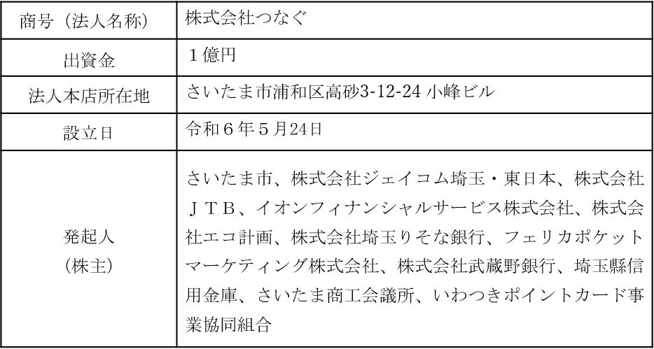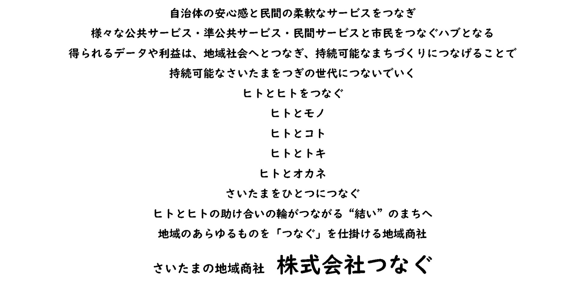 「株式会社つなぐ」は、様々な公共サービス・民間サービスと市民をつなぐことで、地域内での経済循環システムを構築し、持続可能なさいたまを次の世代につないでいきます。