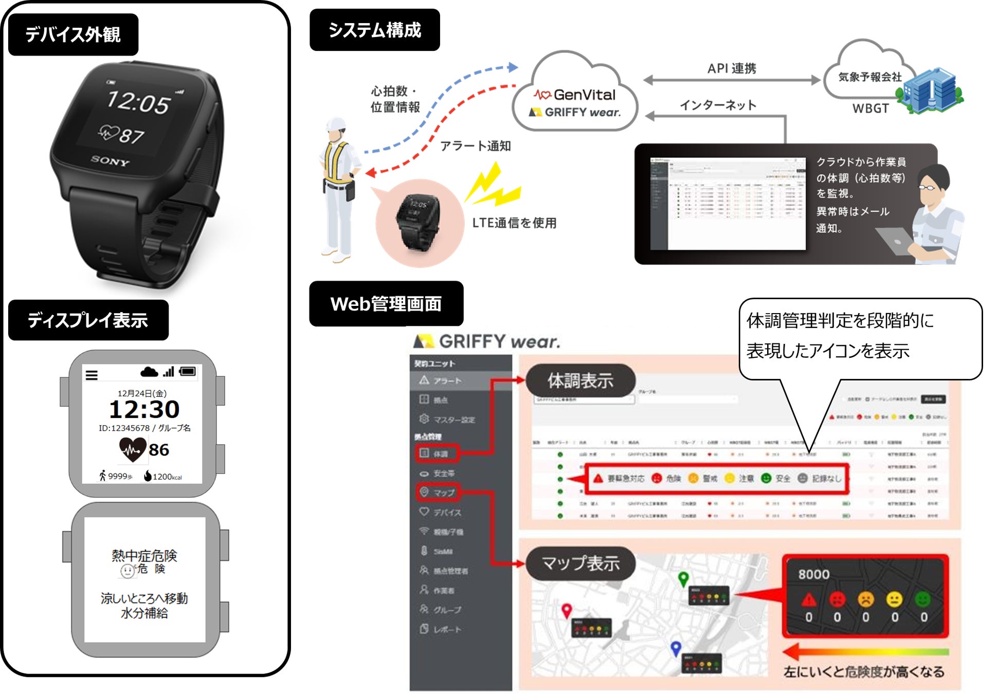 GRIFFYが2024年より提供中の、現場作業員の体調管理ソリューション「GenVital」(ゲンバイタル)では作業員の心拍数をリストバンドにより取得し、親機・子機を介してクラウドにデータ収集を行っておりました。今回、リストバンドをソニーネットワークコミュニケーションズが提供するLTE通信可能な「mSafety™」デバイスに変更し、心拍数に加えて位置情報データを取得することを可能とすることで、親機・子機を設置することなく、作業場所に関わらず作業員の心拍数・位置情報データをダイレクトに取得できます。シンプルな構成により、作業員のリアルタイムな体調と位置情報を把握することで、より安全で効率的な現場管理を支援します。