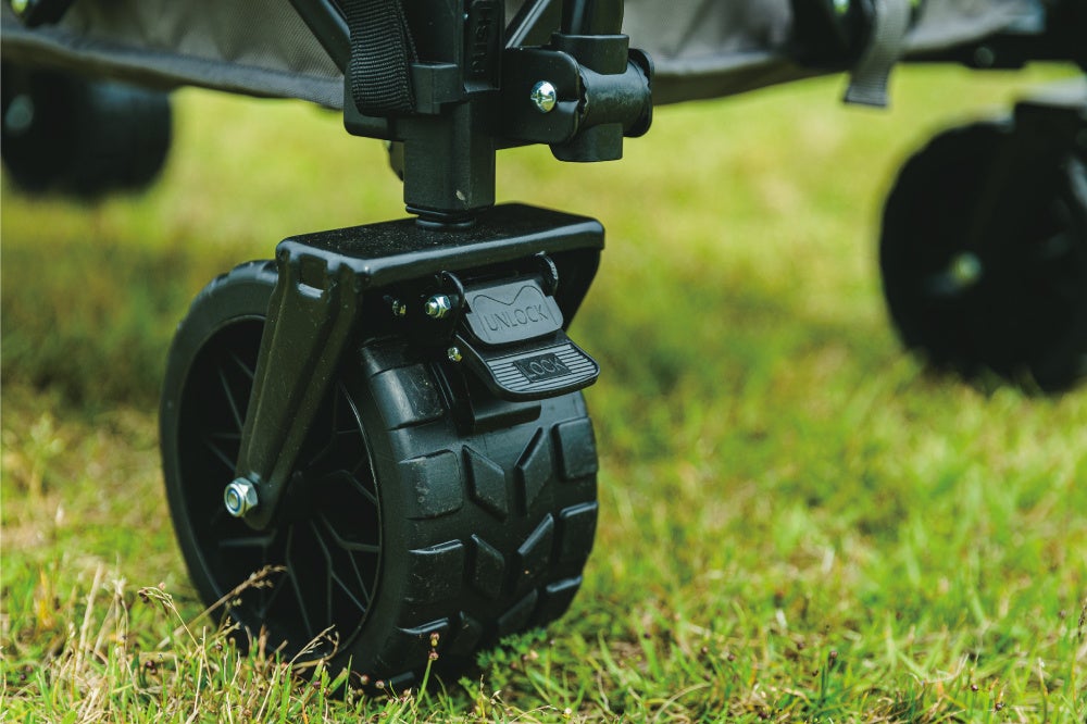 タイヤを取り外せば、ワゴンに荷物を載せたまま車や室内に収納でき、汚れたタイヤで車内や床が汚れる心配もありません。幅広タイヤを採用しているため、芝生・砂利道・砂浜や雨あがりのぬかるんだ地面など、どんな悪路でもスムーズに荷物を運搬することができます。また、ワンタッチでタイヤをロックできる機能も備わっており、平坦な場所の少ないアウトドアシーンでもワゴンが勝手に動いてしまうリスクを減らします。