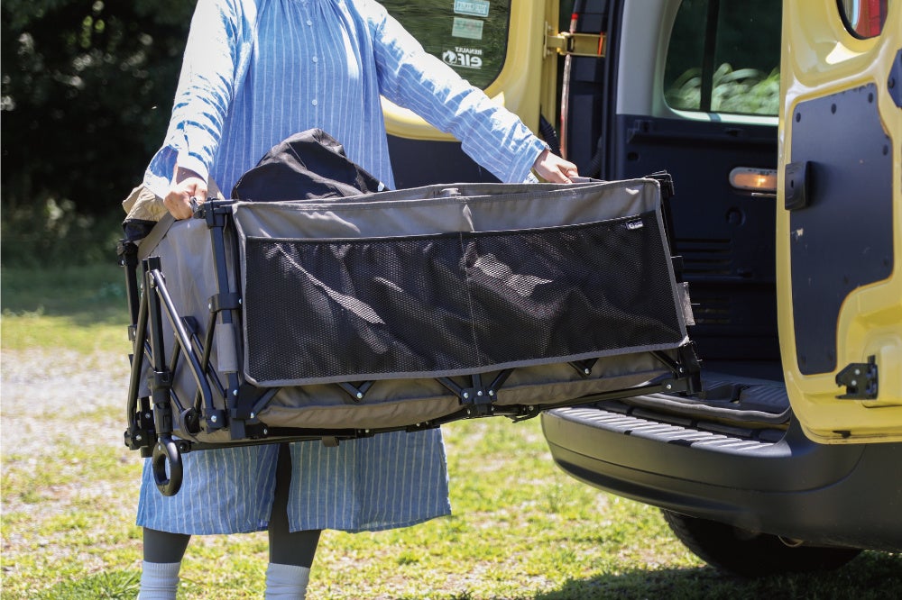 積載量は190Lの大容量サイズで、一度にたくさんの荷物を運ぶことができます。荷物を何往復もして運ぶ時間が、アウトドアをもっと楽しむ時間に。耐荷重も100kgまで対応しており、家族全員分の大荷物も安心して載せることができます。