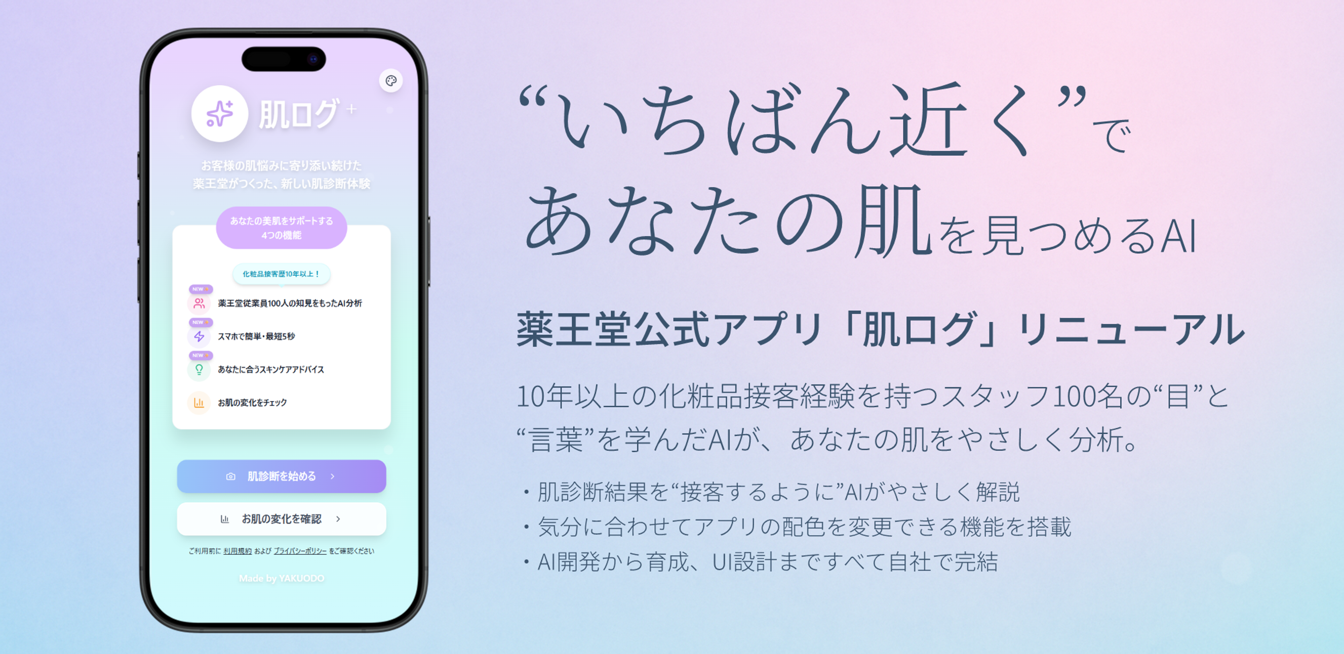 新しい「肌診断」は、設計、学習、検証までの全プロセスを一貫して自社で行いました。複数部署から選抜されたプロジェクトメンバーが連携し、半年間にわたり改良を重ねてきました。この取り組みは、薬王堂として新たな前進を踏み出す第一歩です。