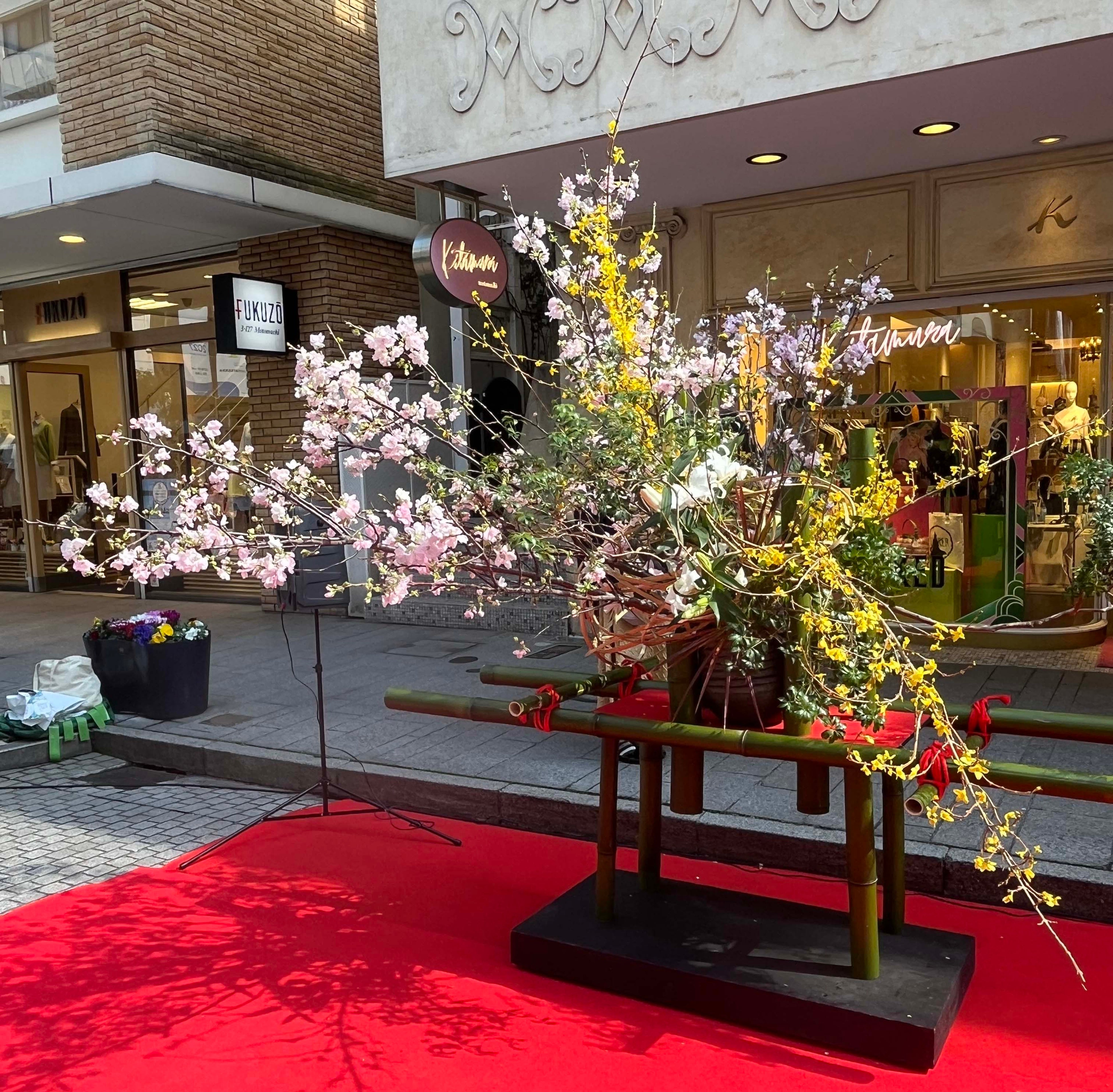 春の元町の街並みに、いけばなの美しさと躍動感が溶け合う、ここでしか体験できない特別なひとときをお楽しみいただけます。