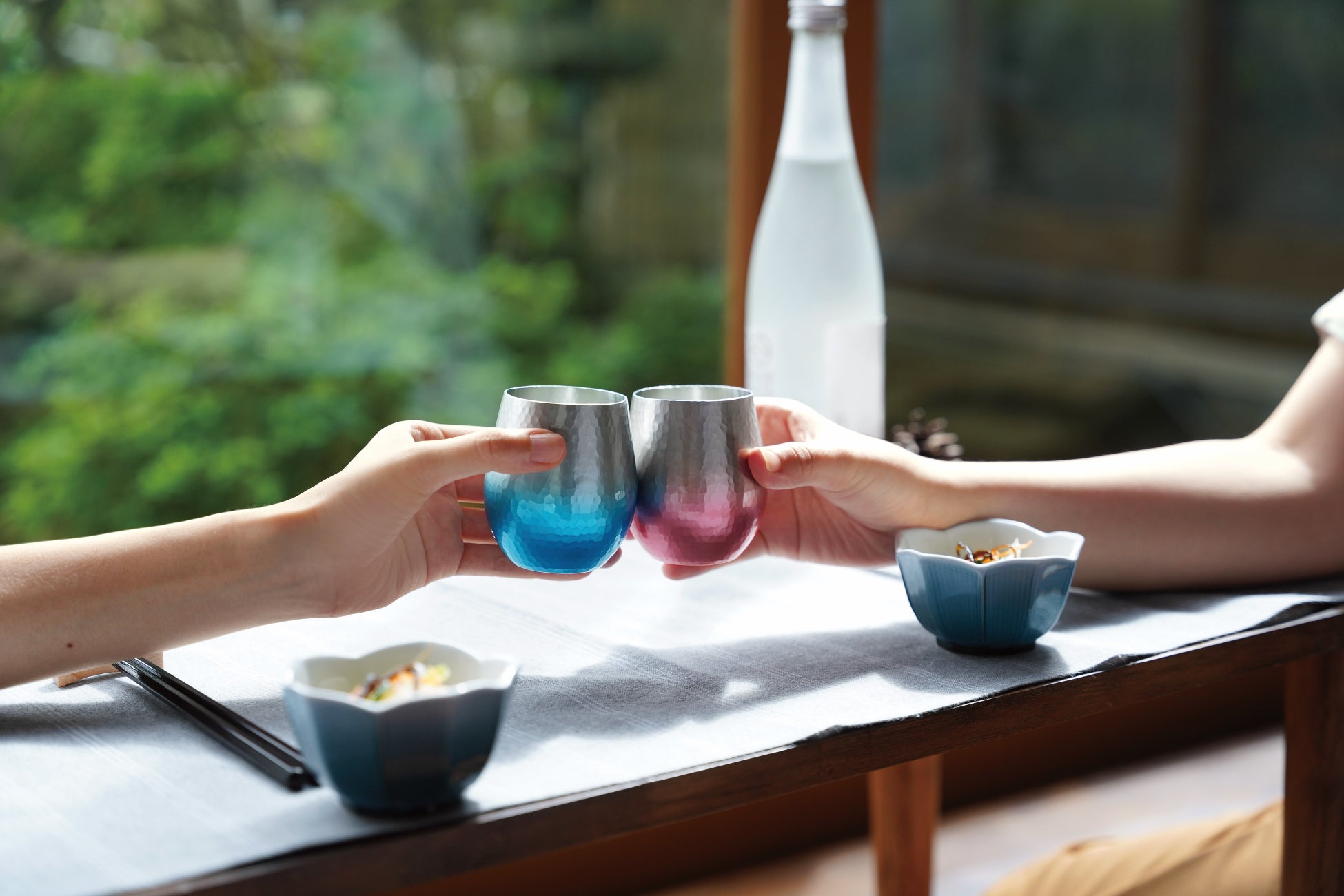 器製造は金属加工の町・燕市の老舗「新光堂」が担当。職人が一打ちずつ手作業で施した鎚目は、錫でコーティングされており、金属特有のにおいを抑え、お酒をまろやかに楽しめます。