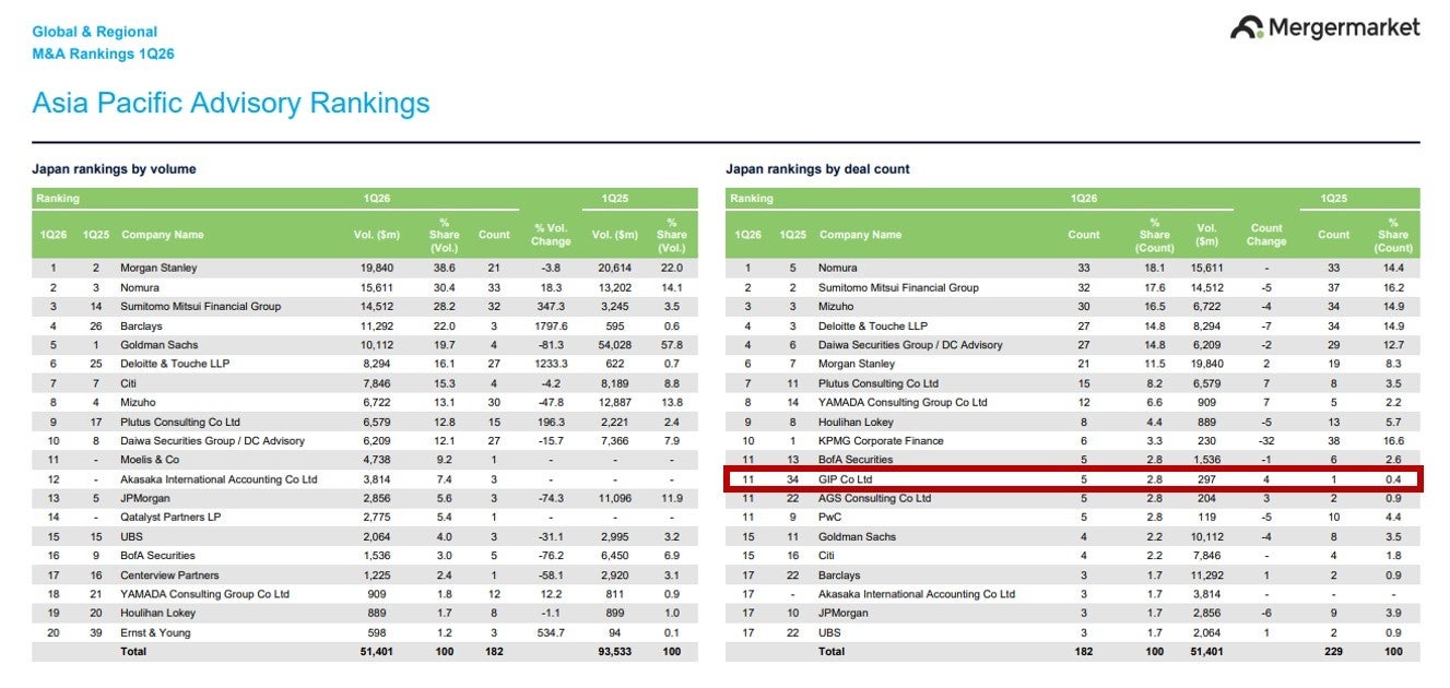 GIP株式会社(本社:東京都千代田区、以下GIP)は、M&Aデータを提供するインテリジェンスプロバイダーのMergermarketが発表した2026年第1四半期(1月〜3月)のM&Aリーグテーブルにおいて、案件数ベースで11位にランクインいたしました。