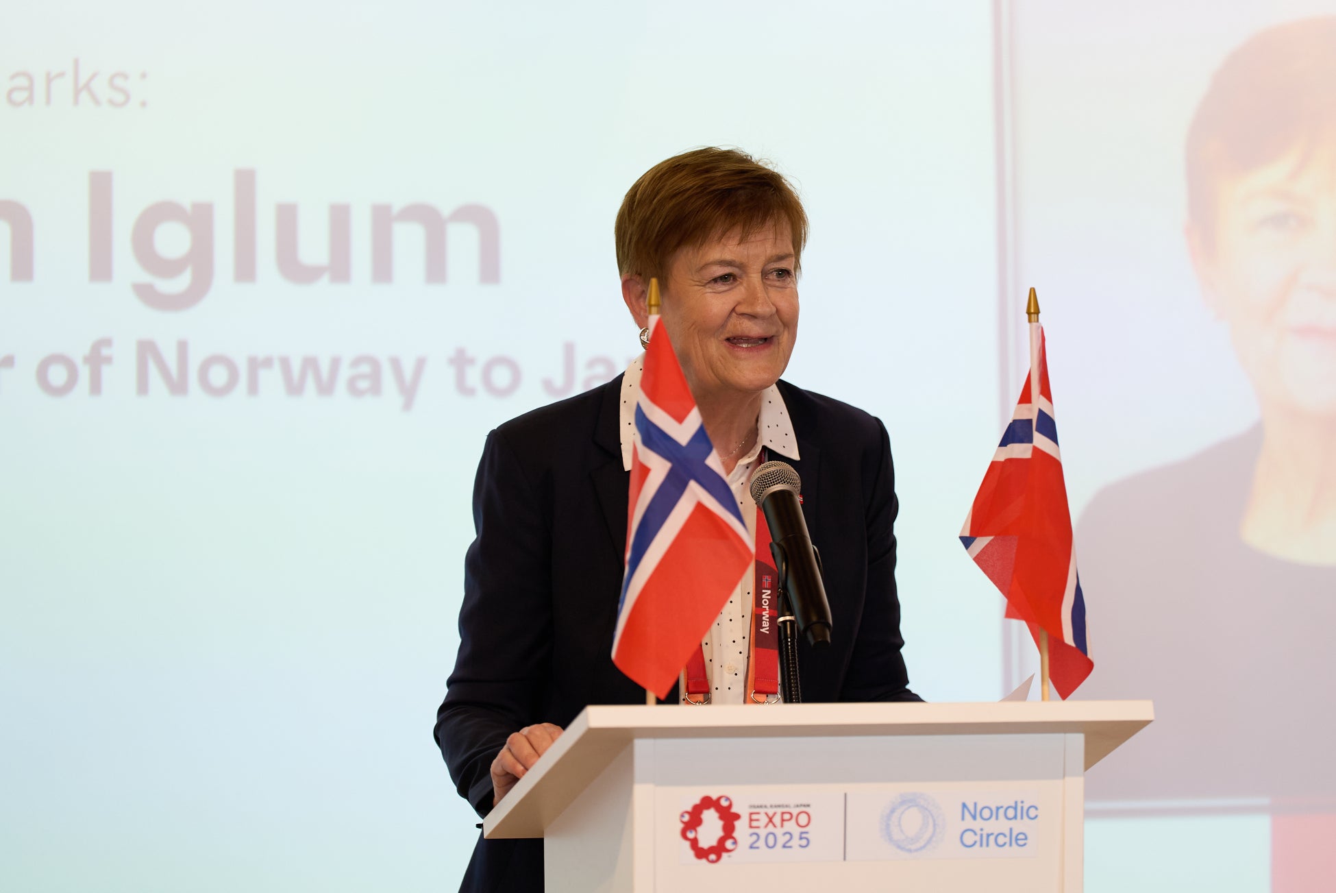 松本政務官様がおっしゃった通り、日本とノルウェーは、戦略的なパートナーシップのもと、強い信頼関係と協力を築いてきました。本日のノルウェー・ナショナルデーは、両国の外交関係樹立120周年という記念すべき節目を祝う日でもあります。松本政務官様が文化について言及されていましたが、今日は歌手のヘレーネ・ボクスレさんの素晴らしいパフォーマンスを通じて、皆様にノルウェーの文化の一端をご紹介できることを、大変嬉しく思います。松本政務官様、ご来賓の皆様、本日はご参加いただき誠にありがとうございました。そして、引き続きどうぞ式典をお楽しみください。