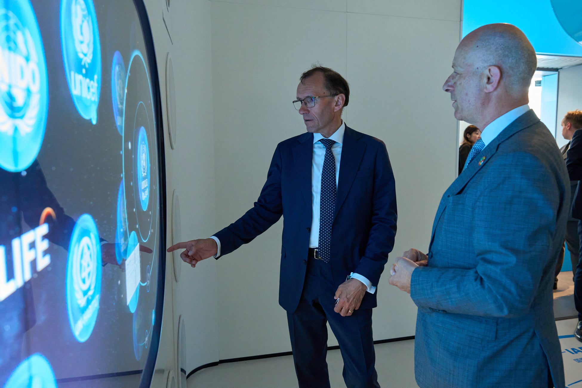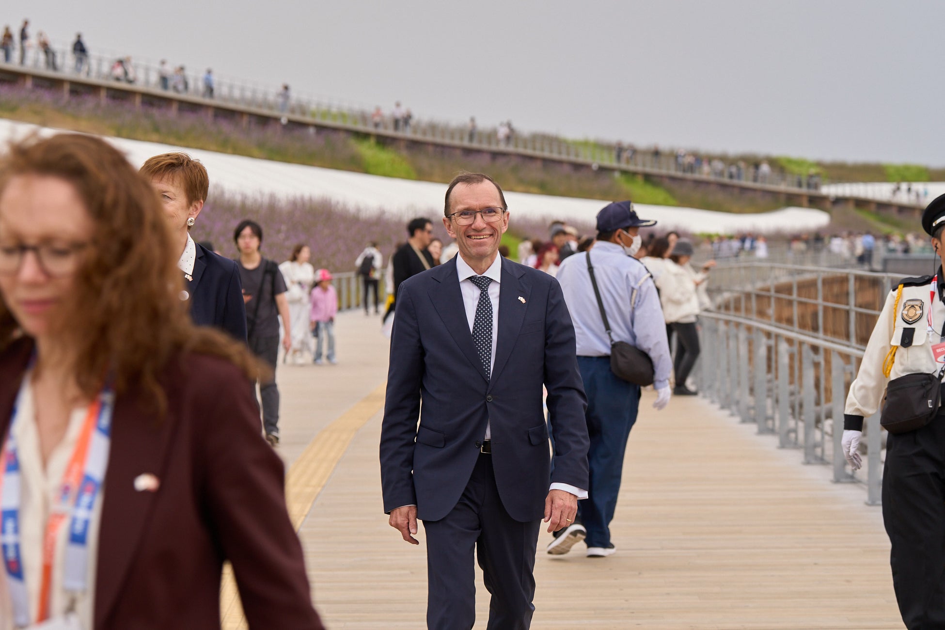 エスペン・バット・アイデ外務大臣は万博会場内の日本館、北欧パビリオン、大阪ヘルスケアパビリオン、国連パビリオン、大屋根リングなどを視察されました。外務大臣は各パビリオンの展示を丁寧にご覧になり、日本が誇る伝統文化や革新的技術について理解を深められました。北欧パビリオンではノルウェー出身のガイドを含むスタッフが温かく外務大臣を迎えました。