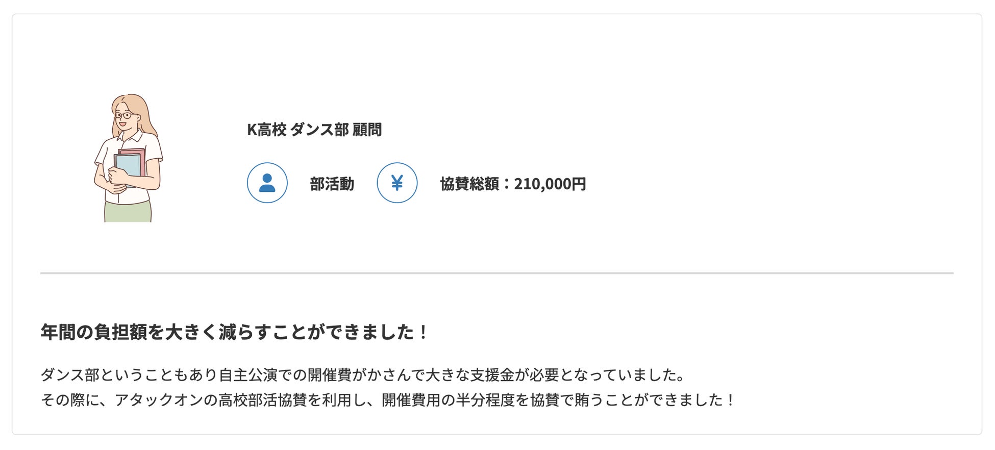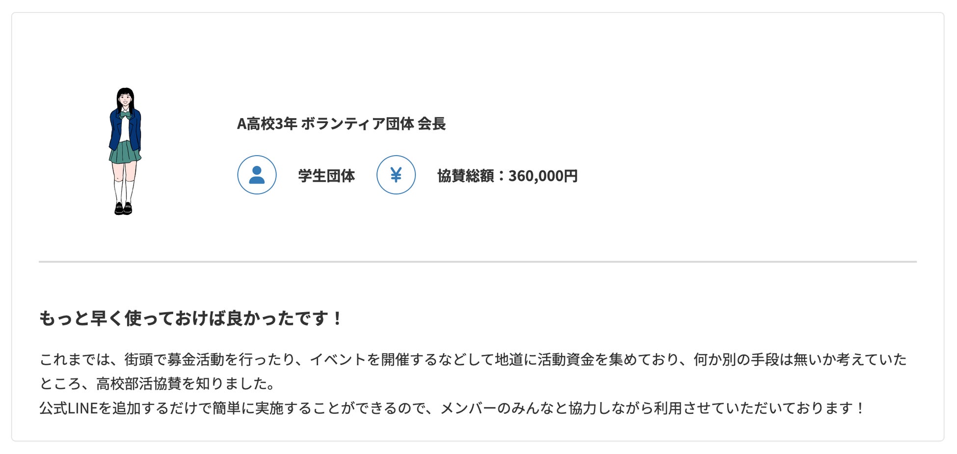 協賛を一度も導入した経験のない団体様でも初月から協賛実施を承諾いただくケースが非常に多く、人数の多い規模感のある部活動の場合だと以下のような嬉しいお声もいただいております。