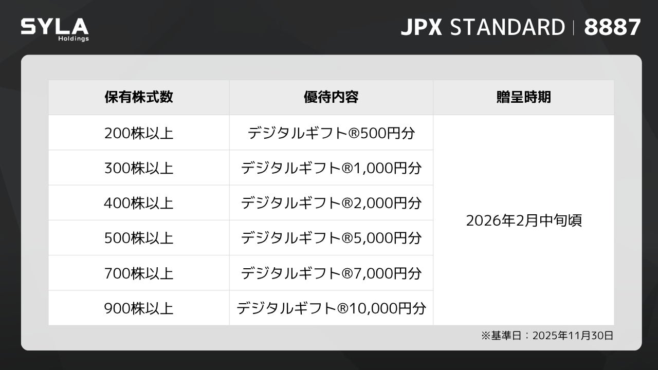 当社は、これまでの継続的な事業成長を支えてくださった株主の皆様へ感謝の気持ちを込めて、2025年11月30日時点(基準日)で当社株式を保有されている株主の皆様を対象とした本優待を実施いたします。