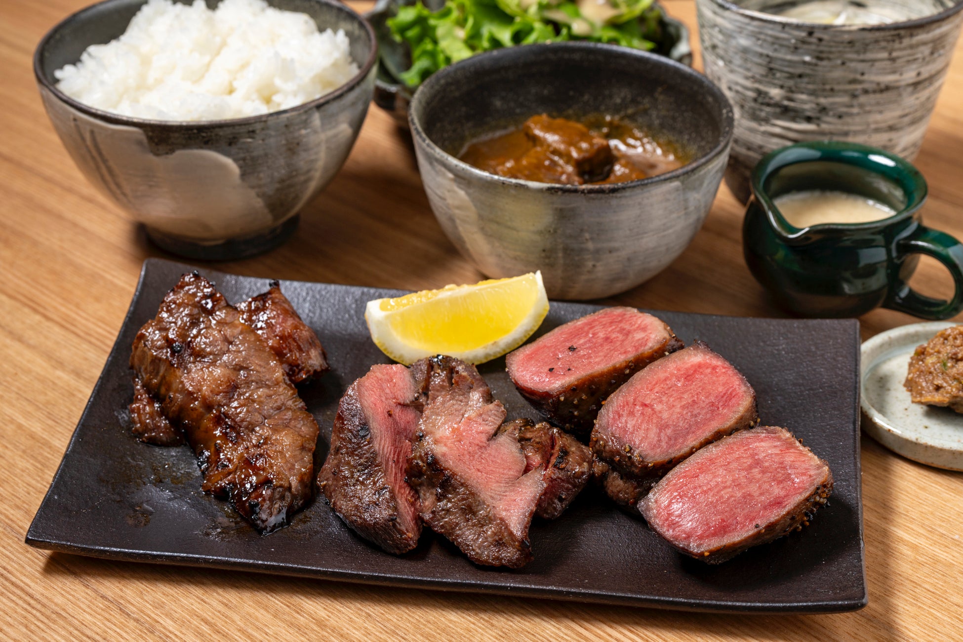 ※どちらのセットにも、サラダ、牛たんスープ、とろろ、牛たん肉味噌、牛たんカレー、羽釜炊きごはんが付きます。