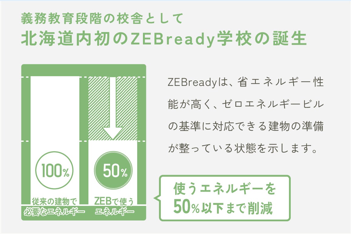 (※2)ZEB Readyとは:年間の一次エネルギー消費量が実質ゼロまたはマイナスの建築物(ZEB:Net Zero Energy Building)の実現を目指す先進建築物として、外皮の高断熱化及び高効率な省エネルギー設備を備えた建築物(環境省ゼブ・ポータルより)北海道の義務教育段階の学校において初取得(2023年取得)