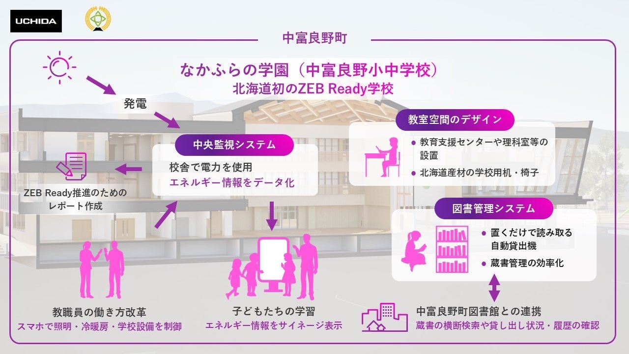 株式会社内田洋行(本社:東京都中央区、代表取締役社長:大久保 昇)は、北海道中富良野町に2025年8月に開校予定の義務教育学校「ラベンダーの杜中富良野町立 なかふらの学園」(※1)において、最新の省エネルギー環境制御に対応した校舎全体の建物設備を管理、運用する中央監視システムの構築を行いました。併せて北海道産木材を使用した学校用の机椅子の導入、図書館システムの導入など学校空間全体の総合的な構築支援を実施いたしました。