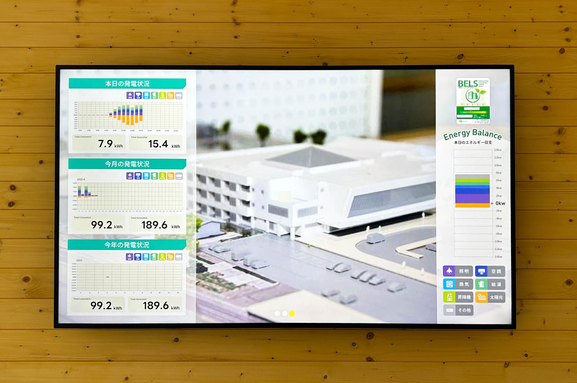 リアルタイムでエネルギー消費状況を表示する「エネルギーサイネージ」を設置し、子どもたちが日常の中でエネルギーの仕組みを“見て学ぶ”環境教育の教材として授業で活用を予定しています。校舎全体を「循環型教材」とすることで、子どもたちは日常の中で環境に目を向け、持続可能な社会について主体的に考え、行動する力を養っていきます。環境と学びを結びつける空間設計として、「創る人」を育てる校舎のあり方を体現していきます。