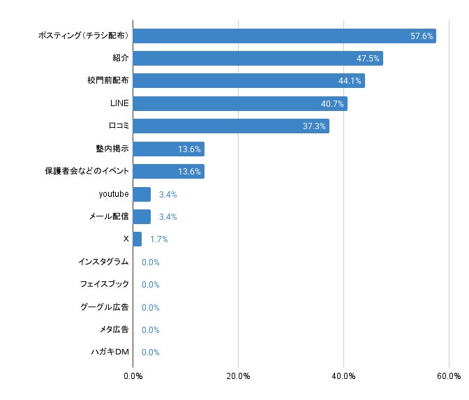 1位に「ポスティング(チラシ、校門前配布)」(57.6%)、次いで、「紹介」(47.5%)、「校門前配布」(44.1%)が並ぶ結果となりました。