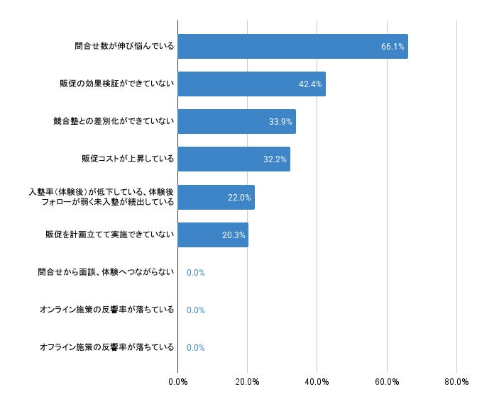 【塾エイド】学習塾59名に聞いた『集客・販促』に関するお悩みアンケート-「問合せ数が伸び悩んでいる」が最多数-