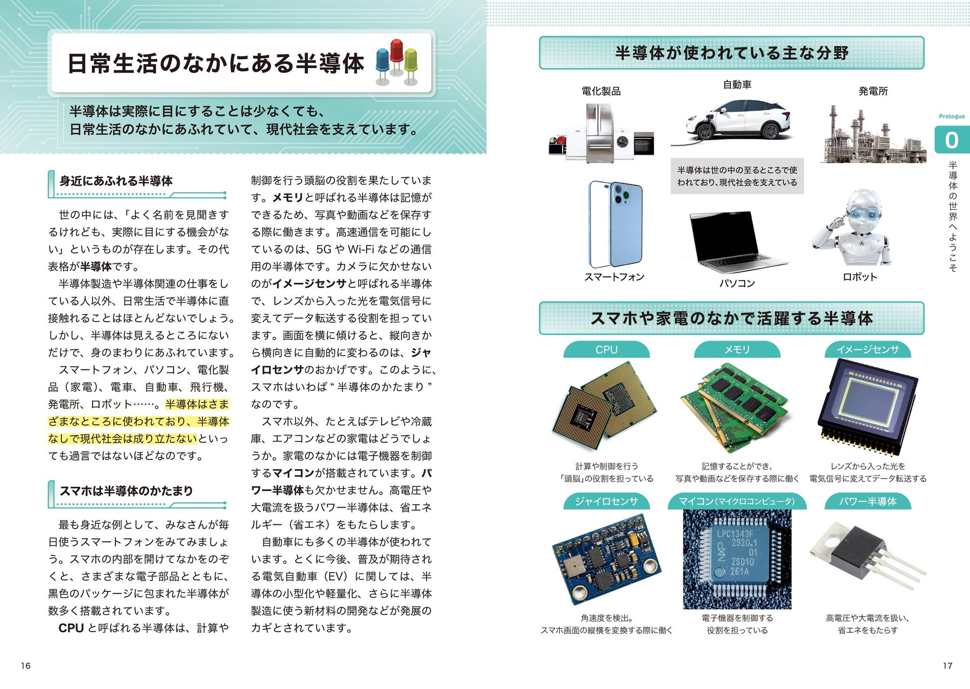 本書のプロローグから3章では、半導体の機械の中での役割や基本的な動作のしくみ、製造プロセスについて解説しています。