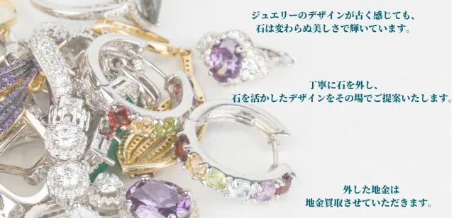 片方失くしてしまったピアス、デザインが古くなってしまったジュエリー、ご親族から譲り受けたジュエリー、お持ち込みください。