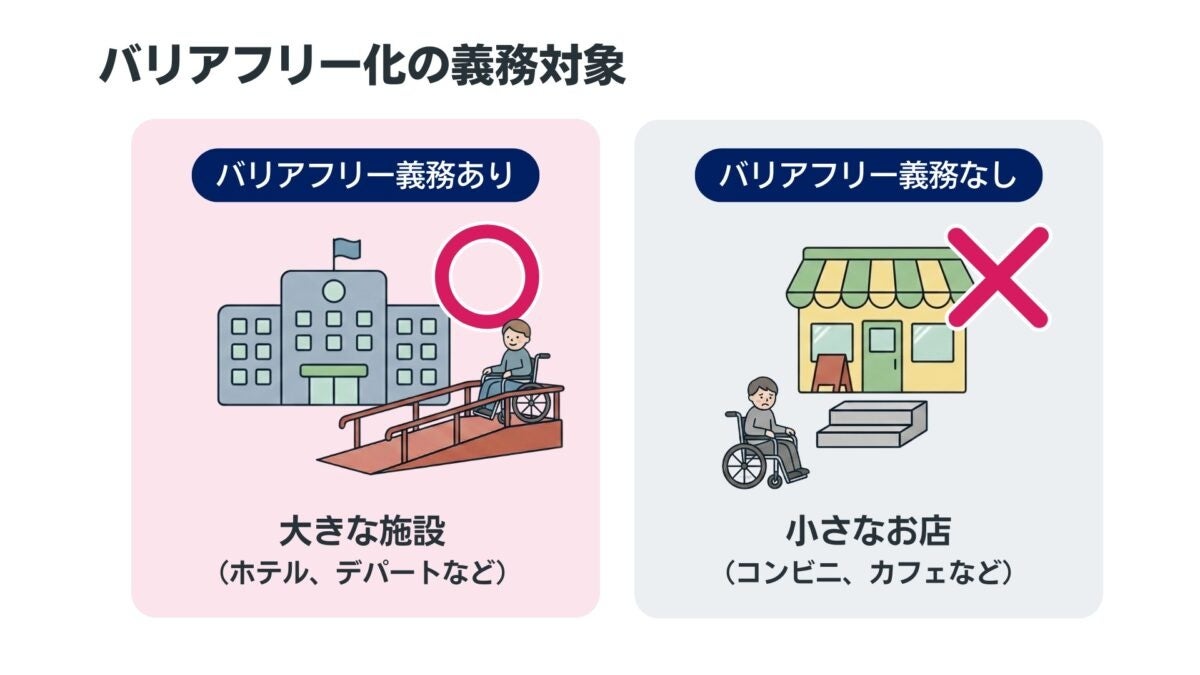 「2,000㎡の壁」が作る空白 現行法では、体育館2つ分(2,000㎡)以上の大きな建物にしかバリアフリー義務がありません。私たちが毎日利用するコンビニやカフェの多くは、この義務の対象外となっており、バリアフリーの「空白地帯」になっています。