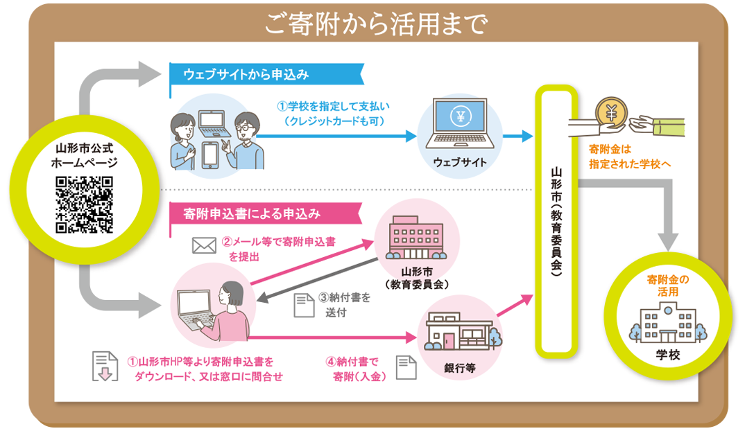 母校などのマイスクールを応援したいという方の中には、山形市内に在住していない方も多くいます。そのような方々でも、気軽にいつでも寄附ができる取り組みとして、ウェブを活用した寄附の受付を期間限定で実施しました。(令和7年6月6日~9月3日)