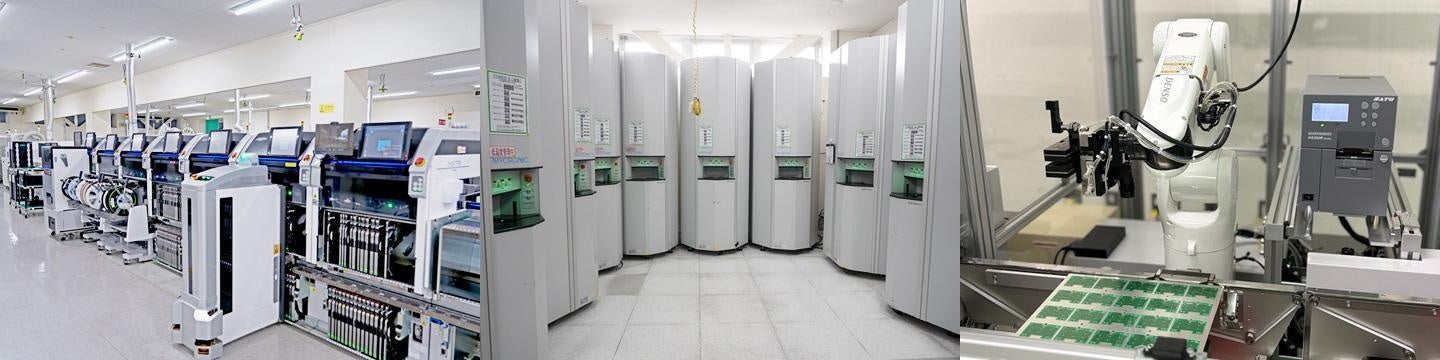 国内工場では、Panasonic製およびFUJI製の最新鋭マウンタラインを導入し、SMT工程の自動化・省人化を推進しています。さらに、40台のSMDタワーとの連携によるリール部材の自動払い出しにより、段取り替え時間を大幅に短縮。高効率かつ安定した生産環境を実現しています。