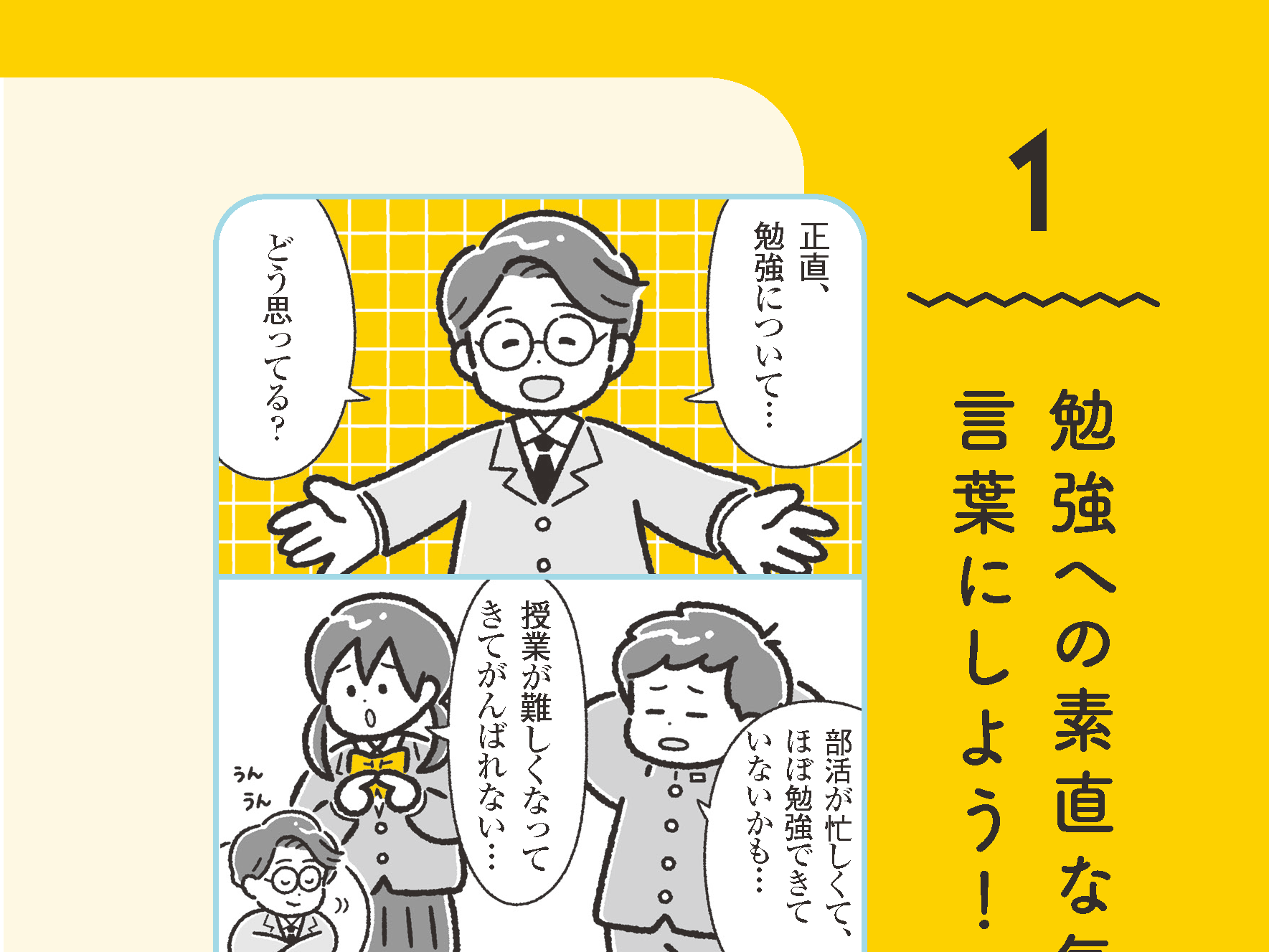 各項の冒頭に中高生の「あるある」な悩みを漫画化。文章を読むのが苦手な生徒でも、内容がスッと頭に入ります。