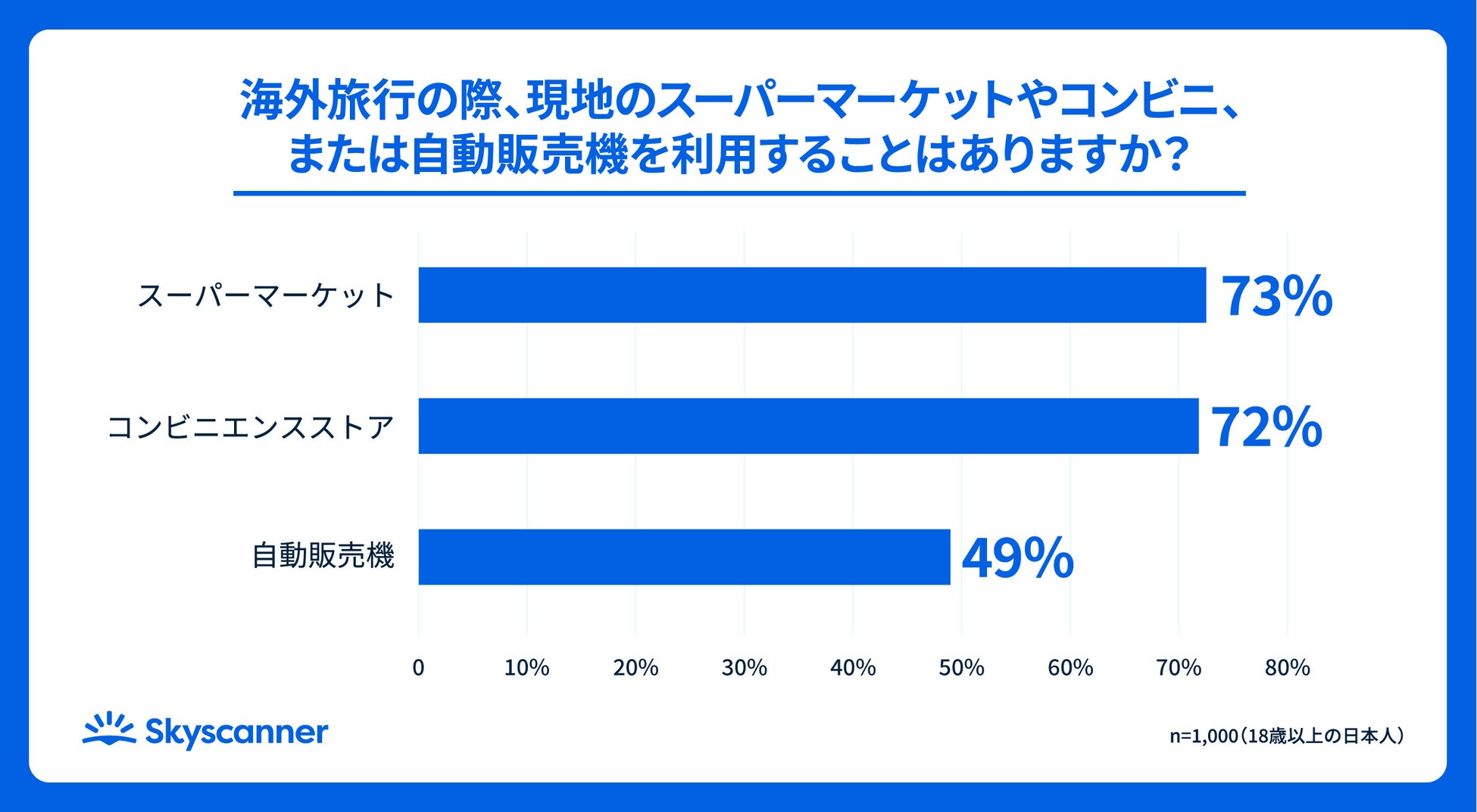 旅行における醍醐味の一つとして旅行先でしか味わえない体験が挙げられますが、スーパーマーケットやコンビニ、自動販売機についてもどのくらい訪れるのか、調査を行いました。その結果、「スーパーマーケット(73%)」「コンビニエンスストア(72%)」「自動販売機(49%)」と、多くの人が訪れることが判明。より現地の人の暮らしに似た体験を求めるように変化してきていることが伺えます。