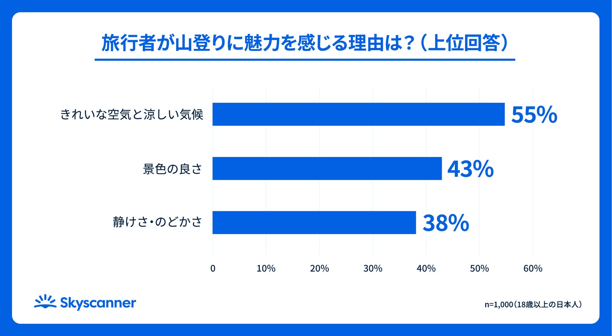 旅行者が山登りに魅力を感じる理由は、「きれいな空気と涼しい気候」(55%)、「景色の良さ」(43%)、「静けさ・のどかさ」(38%)が上位に来る結果に。これらのことからも、旅行者が山登り体験を通して身体を動かし、都会から離れた空間でのリフレッシュ、デジタルデトックスを試みていることが推察されます。