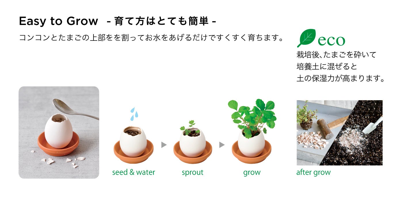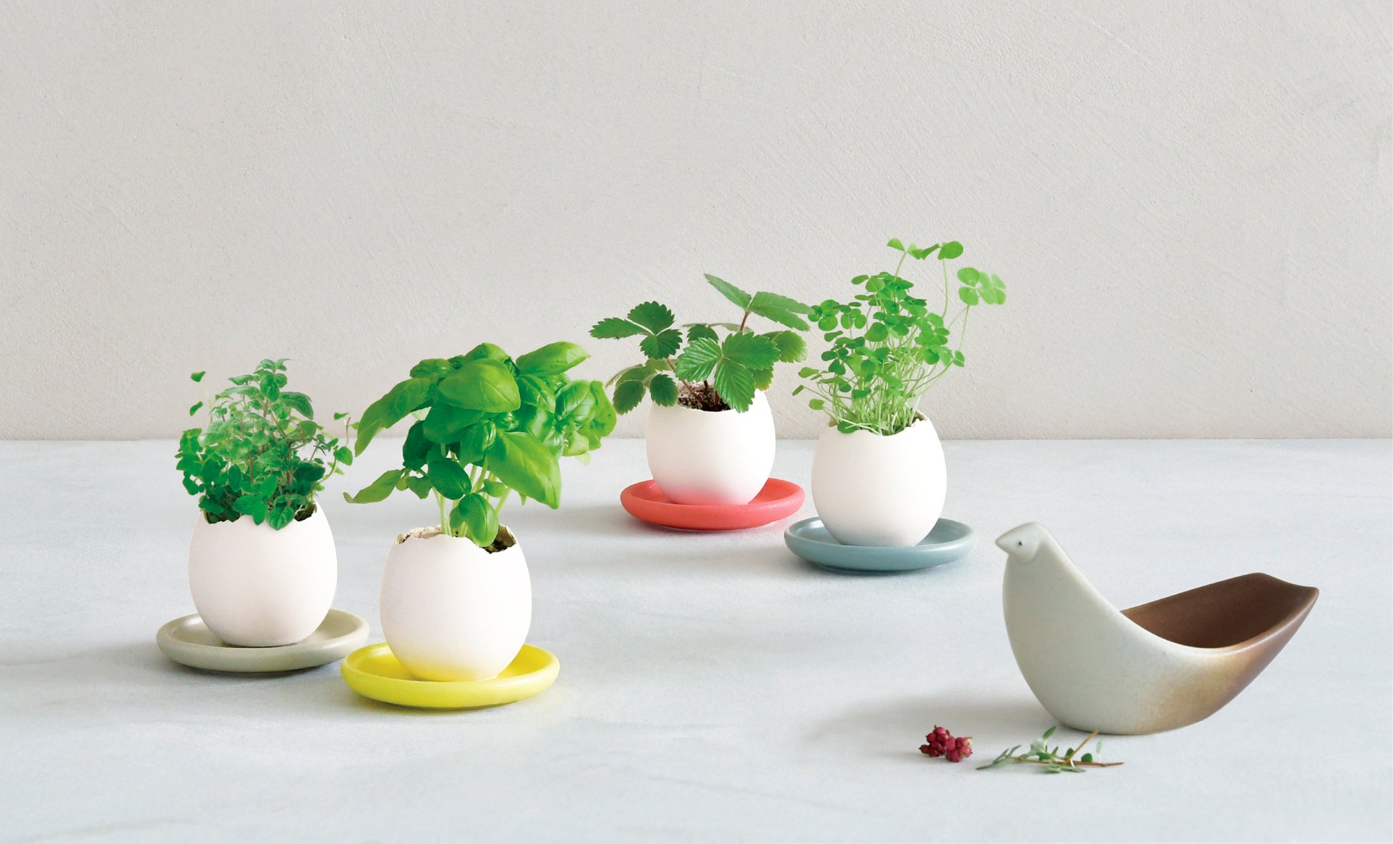 「eggling」は、陶製のたまご型の器の中に、種と土をセットした栽培キットです。たまごの上部をスプーンなどで割って水を与えるだけで植物が育ち、初めての方でも気軽に栽培を楽しめます。