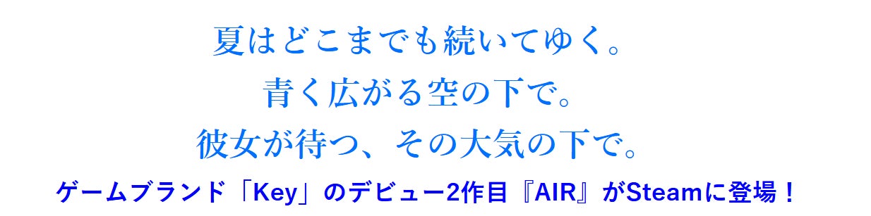 株式会社ビジュアルアーツ(本社:大阪府大阪市 代表取締役:天雲玄樹)は、ゲームブランド「Key」から発売中の恋愛アドベンチャーゲーム『AIR』のSteam版が2025年3月5日(水)に発売決定したことをお知らせいたします。