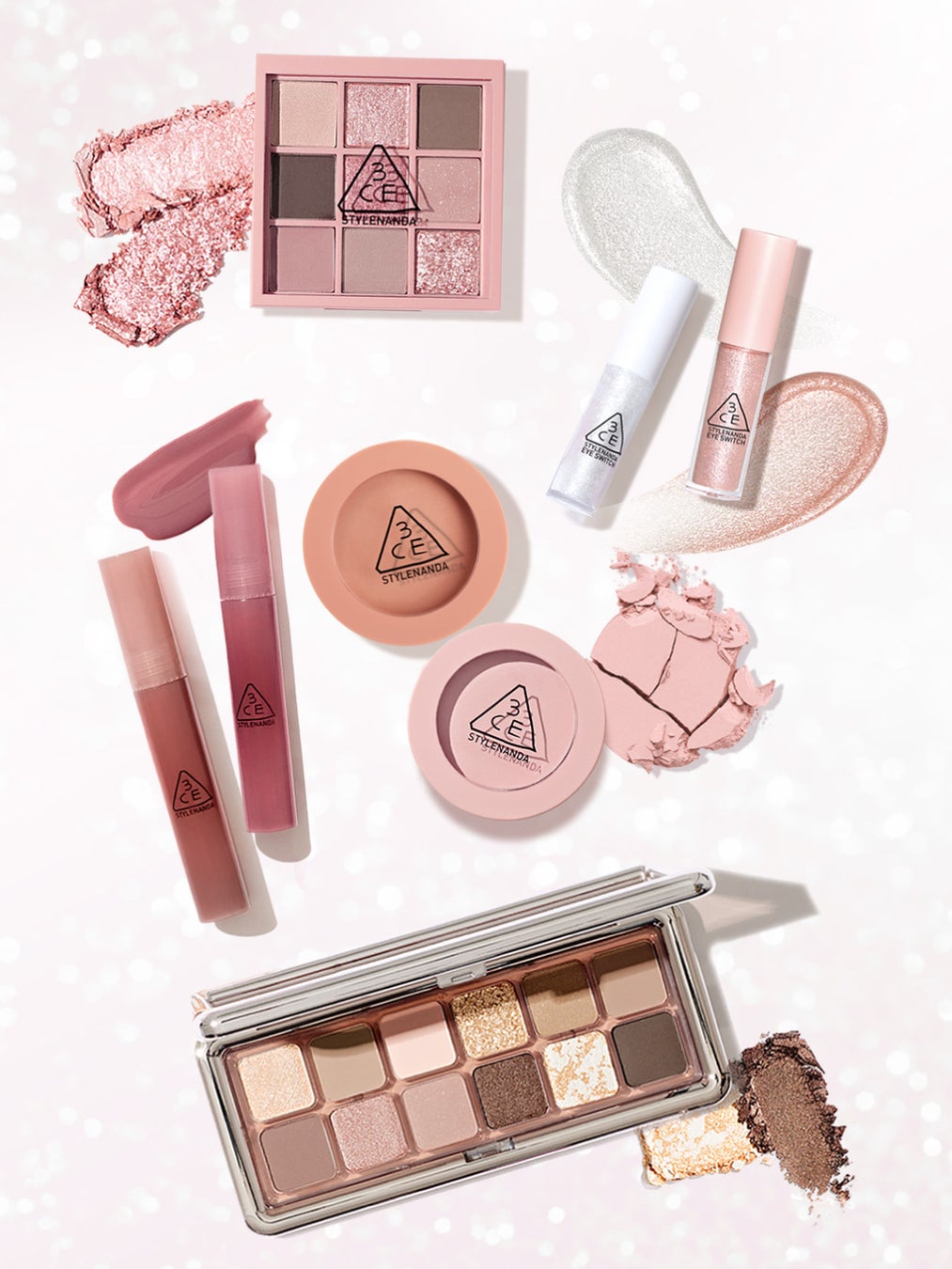 韓国メイクのトレンド、“キラキラ”דピンクワントーン” を、3CEらしく洗練されたスタイルで実現する「ピンククリスタルコレクション」で、ワンランク上の春メイクを楽しんで。