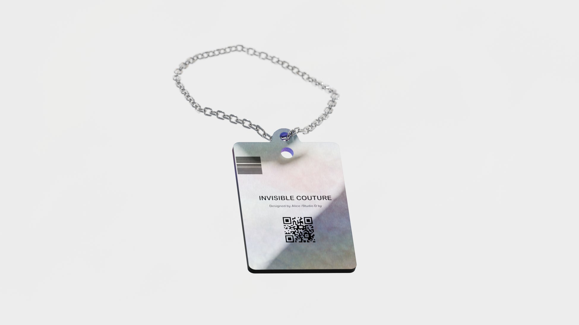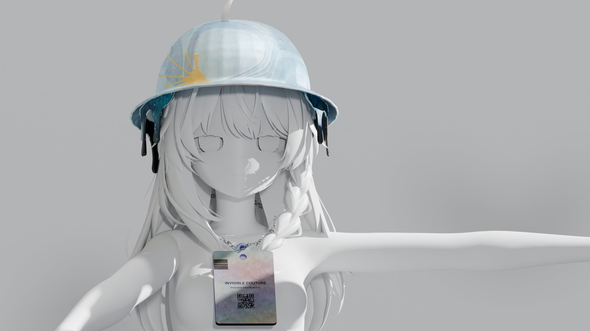 本コレクションの象徴的なアイテム。タグだけの服でもあり、このアイテムを着用してVRChatのカメラにかざすとアイコニックな”実は着ている服”が現れる。